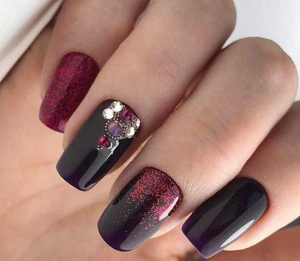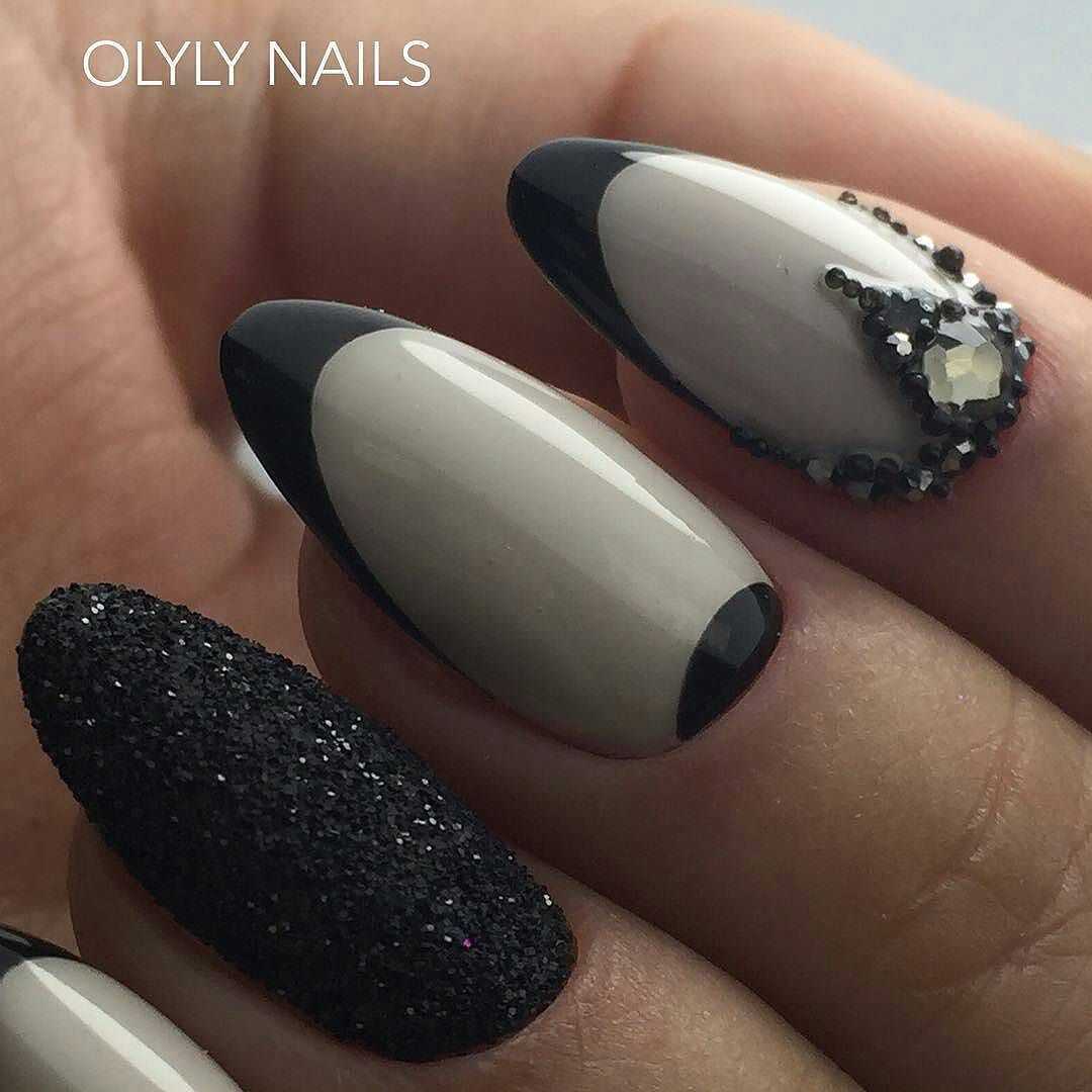 Дизайна должно быть немного, иначе маникюр будет смотреться слишком вычурно. Если вы решили выполнить лунный маникюр в черном цвете, то блестящим декором выделяйте только прикорневую зону. При желании можно добавить в маникюр выкладку стразами на одном из ноготков.
