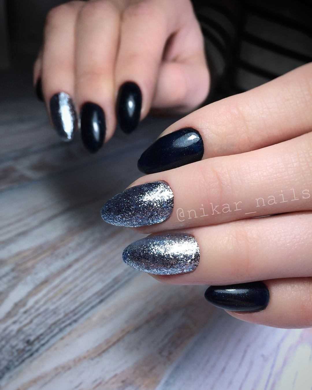 Наносим покрытие на ноготки и украшаем разными вариациями блёсток. Можно применить технику омбре, акцентировать блестящие материалы на безымянном пальчике или любой части ноготков в виде лунок, полосок, оригинальных орнаментов или узоров