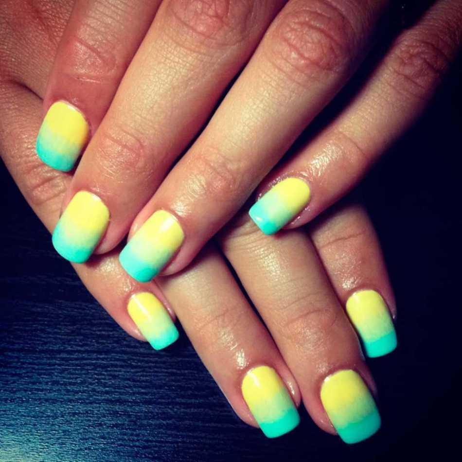 Маникюр желтый с бирюзовым с рисунком, стразами, градиент, блестками и золотом