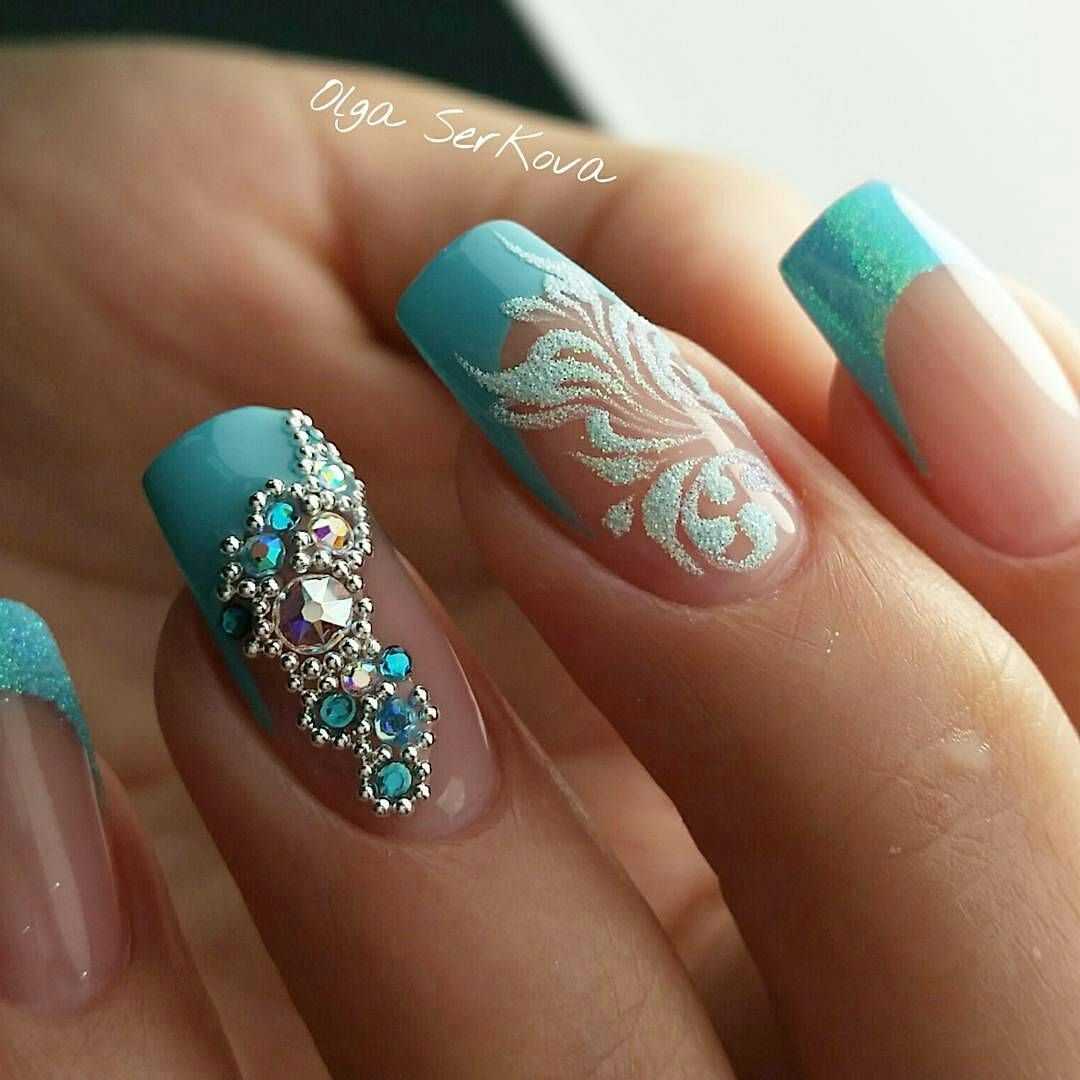 Они прекрасно дополняют маникюр с бирюзовым лаком. Если пластины короткие, квадратной формы, достаточно «положить» на них по одной бусинке. Когда ногти длинные, есть где разгуляться. Тут можно сочетать стразы разной величины или зарихтовать ими один из ногтей.