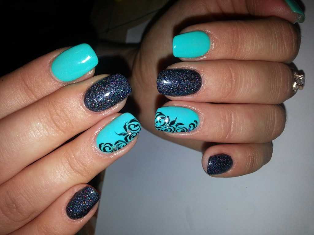 Одним из эффектных и интересных способов оформления ногтей в этом сезоне стало сочетание в маникюре бирюзового и чёрного цветов. Бирюзовый оттенок подходит нежным и хрупким девушкам, а чёрный в то же время — более смелым и уверенным в себе дамам. На первый взгляд кажется, что совместимость этих противоположных между собой оттенков просто не возможна. Но, как оказалось дуэт этих двух цветов очень популярен в дизайне ногтей. Самыми модными стали техника окрашивания омбре и френч, разнообразие разных текстур, преобладание одного из цветов, изображение различных орнаментов, акцентированное окрашивание и другие варианты.