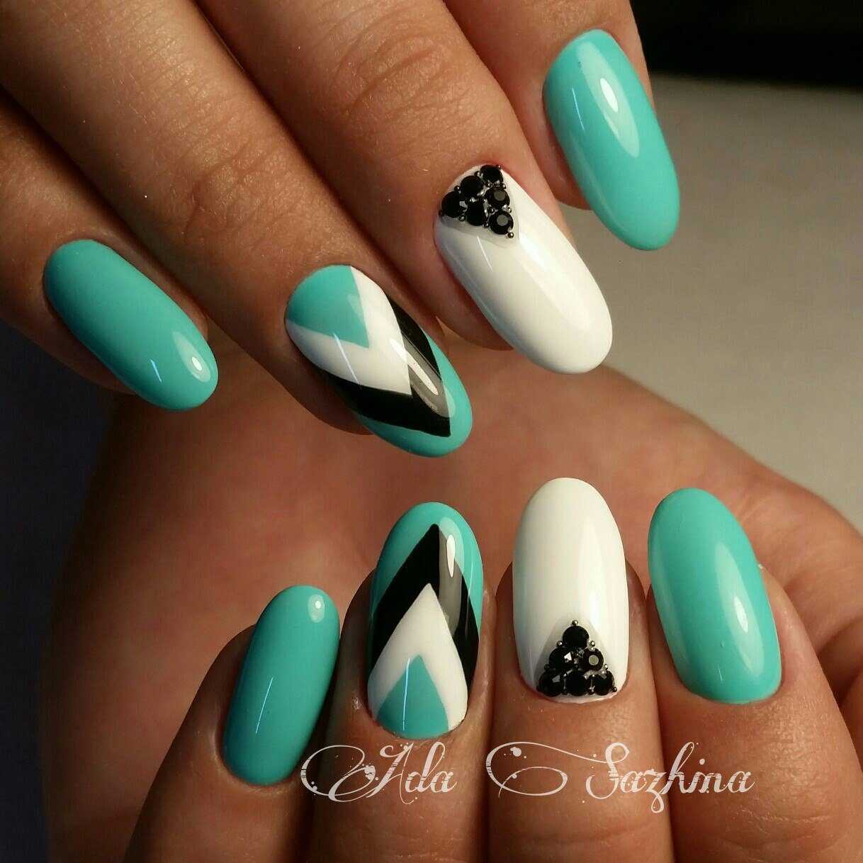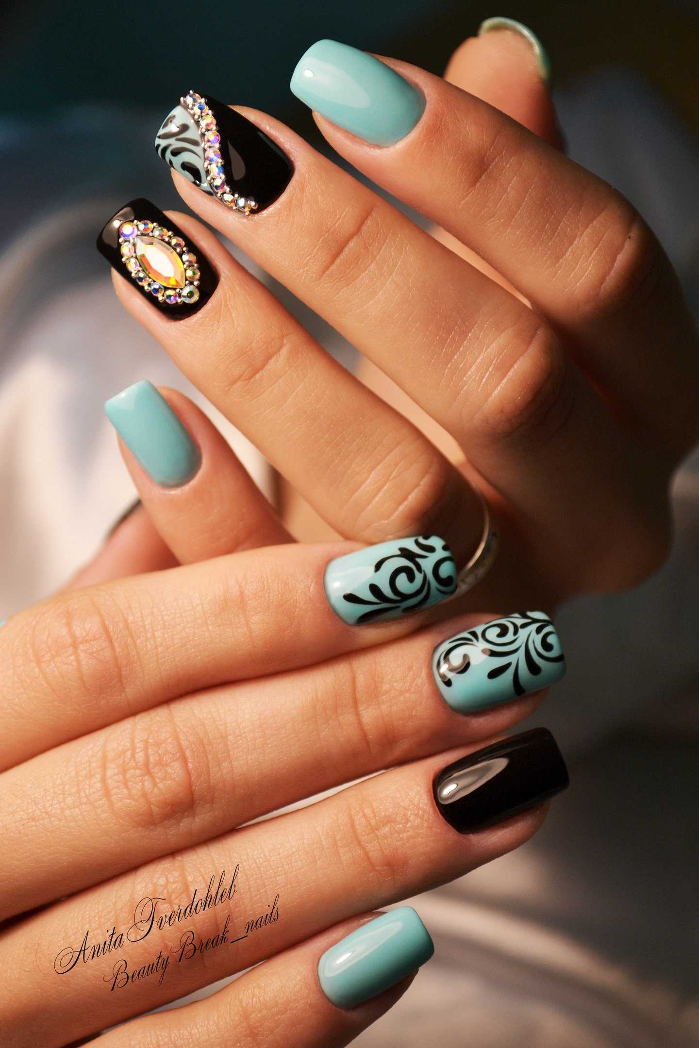 Идей черно-бирюзового маникюра огромное количество. Это могут быть аккуратные полоски черным цветом на бирюзовом фоне, отпечатка бирюзовой фольгой на черном фоне, рисунки-оригами в черном цвете на бирюзовом ноготке.