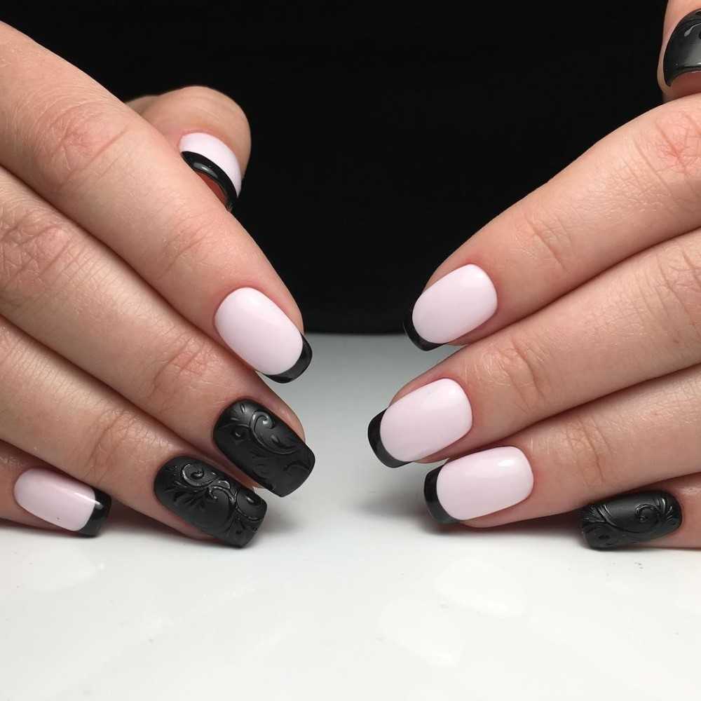 В этом сезоне модны узоры, которые наносятся на неокрашенную безымянную ногтевую пластину. В таких случаях сначала наносят основу без блеска, а затем темным лаком поверх основы создают узор.