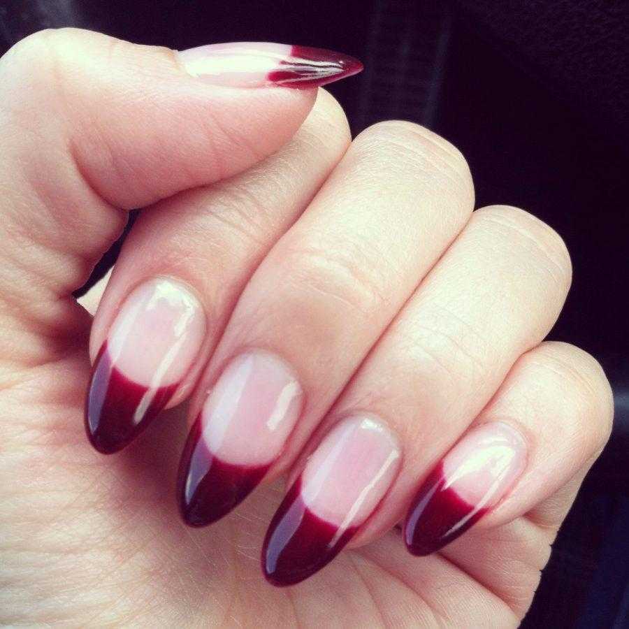 Бордовый лунный маникюр смотрится броско и необычно, так как многие ассоциируют этот дизайн с пастельными оттенками. Но такое отступление от общепринятых правил может выгодно подчеркнуть форму ногтя, внеся в образ свою изюминку.