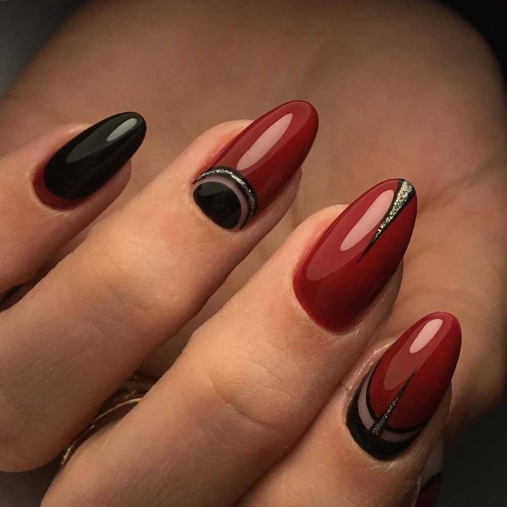 Модной тенденцией нейл-арта для бордового маникюра 2021-2022 является «особенный палец». Он подразумевает акцент на один ноготок, окрашенный эксклюзивно. Существует масса вариантов воплощения этой идеи. Самый простой сочетает в себе различные цвета и текстуры, не включая при этом использование стразов, узоров и других элементов декора. К примеру, 4 ноготка окрашивают бордовым лаком, а безымянный палец покрывают золотым лаком.