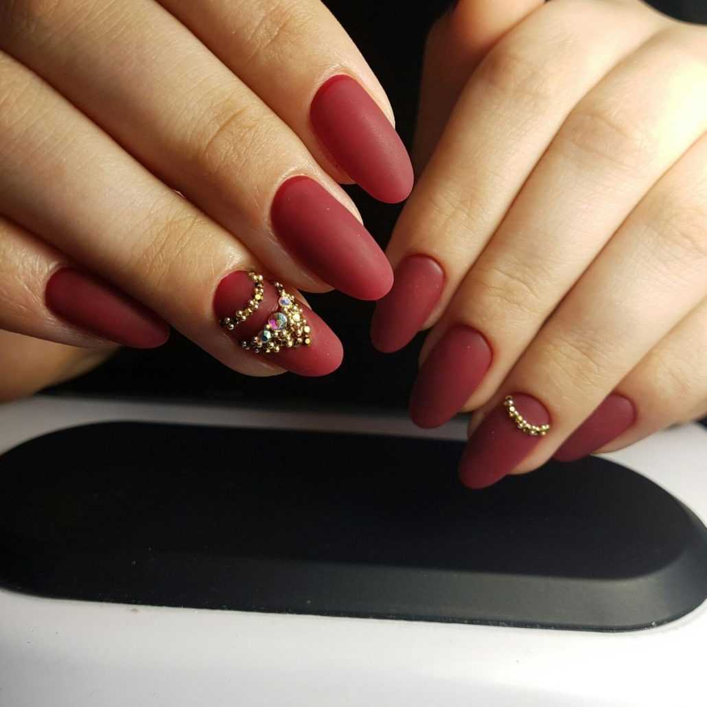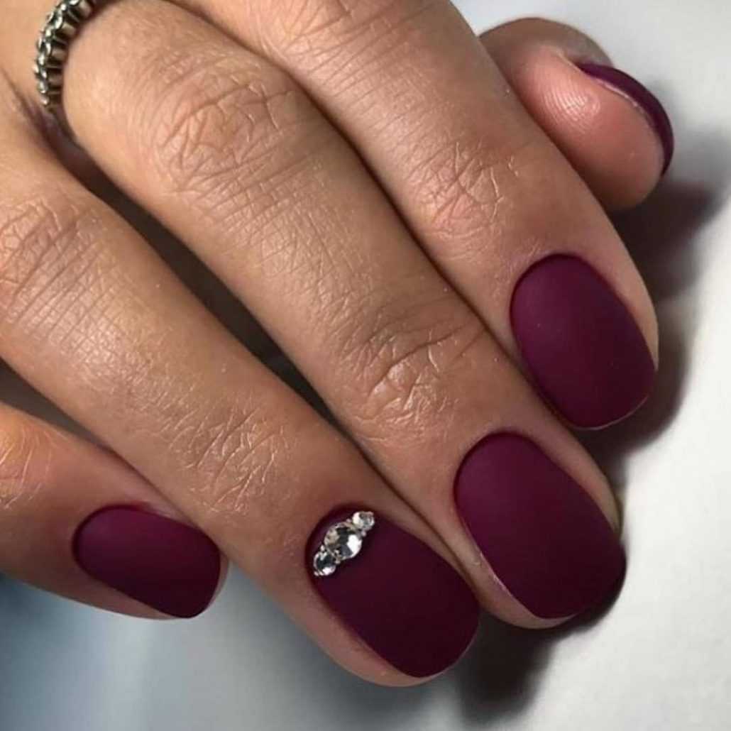 Добиться матового эффекта можно несколькими путями: купить бордовый лак, который матируется на ногтях, или нанести матирующий топ поверх шаллака. Оба варианта потрясающе смотрятся на пальчиках дам.