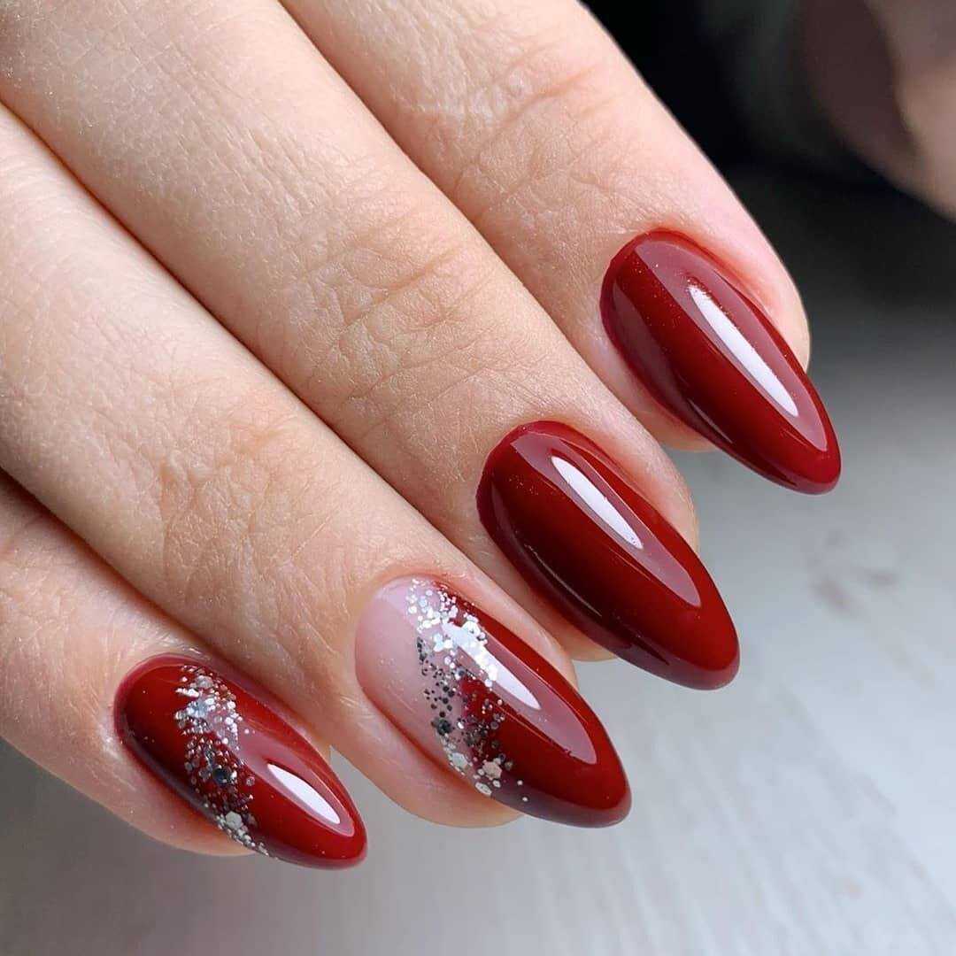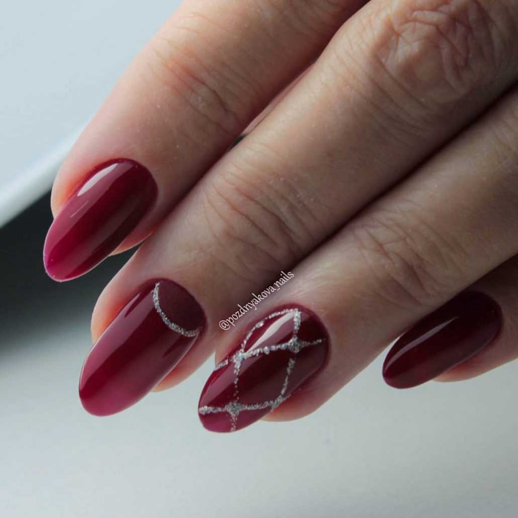 «Холодное» сияние серебра просто чудесно дополняет благородное бордовое покрытие. И даже не смотря на яркость лака, маникюр с серебряными блёстками выглядит очень сдержанно. Вы можете отдать предпочтение однотонному покрытию с выделением сверкающими частицами ногтевой пластины на безымянном пальце или украсить пару ноготков серебристыми вертикальными полосками. Очень интересно смотрится декорирование мелкими частицами лунки или кончика ногтевых пластин в стиле френча, а также серебристые узоры и геометрические фигуры. Такая идея обязательно придётся по душе модницам, предпочитающим холодные оттенки лаков. Помимо этого, бордовый маникюр с серебром может стать прекрасным дополнением новогоднего образа. Несколько снежинок или завитков, и волшебная сказка на ноготках готова.