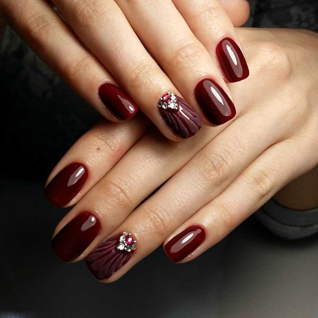 Отличным беспроигрышным вариантом являются прозрачные стразы – они восхитительно смотрятся на бордовом. Их раскладывают в линию вдоль ногтевой пластины или по диагонали. Стразами украшают лунку или край ногтя, они могут быть в одном цвете или разноцветными.