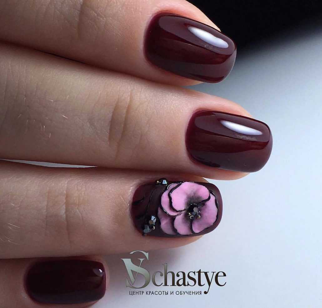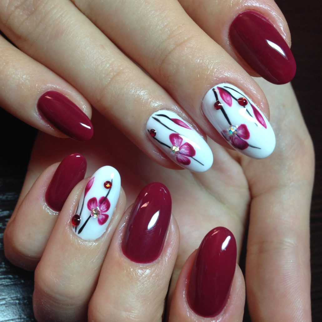 Бордовый цвет в качестве основы для маникюра выбирают только уверенные в себе и элегантные дамы. Приглушенный и сдержанный оттенок имеет множество преимуществ, которые создадут невероятный и сногсшибательный дизайн. Маникюр с цветочными рисунками на бордовой основе превращает умеренный дизайн в непревзойденный маникюр для различных мероприятий.