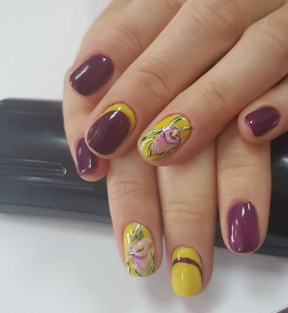 Девушкам с короткой длиной ноготков не стоит сдерживать себя и отказываться от выполнения бордового маникюра с цветочными изображениями. В данном случае главное не перегружать дизайн излишними узорами, а выполнить несколько бутончиков или веточек. Таким образом, получится очень нежный и гармоничный маникюр, который дополнит различные образы.