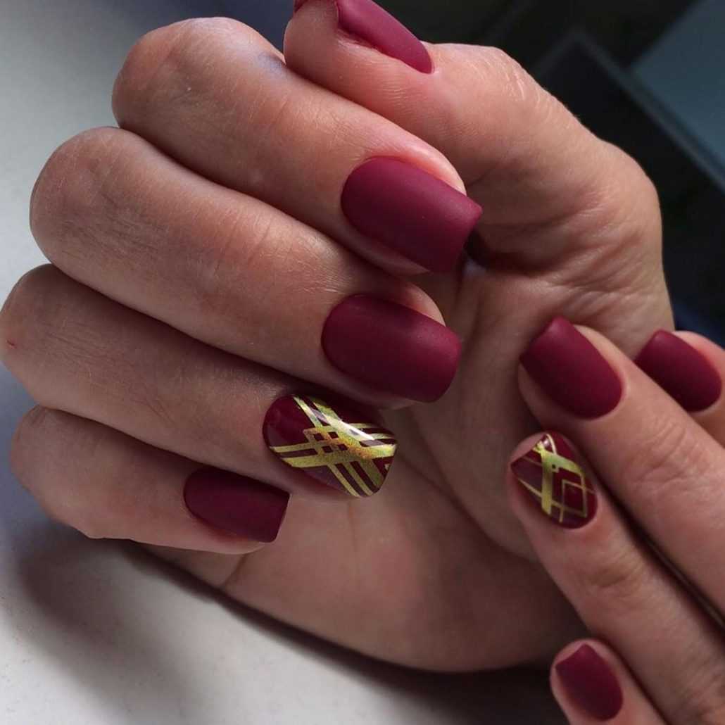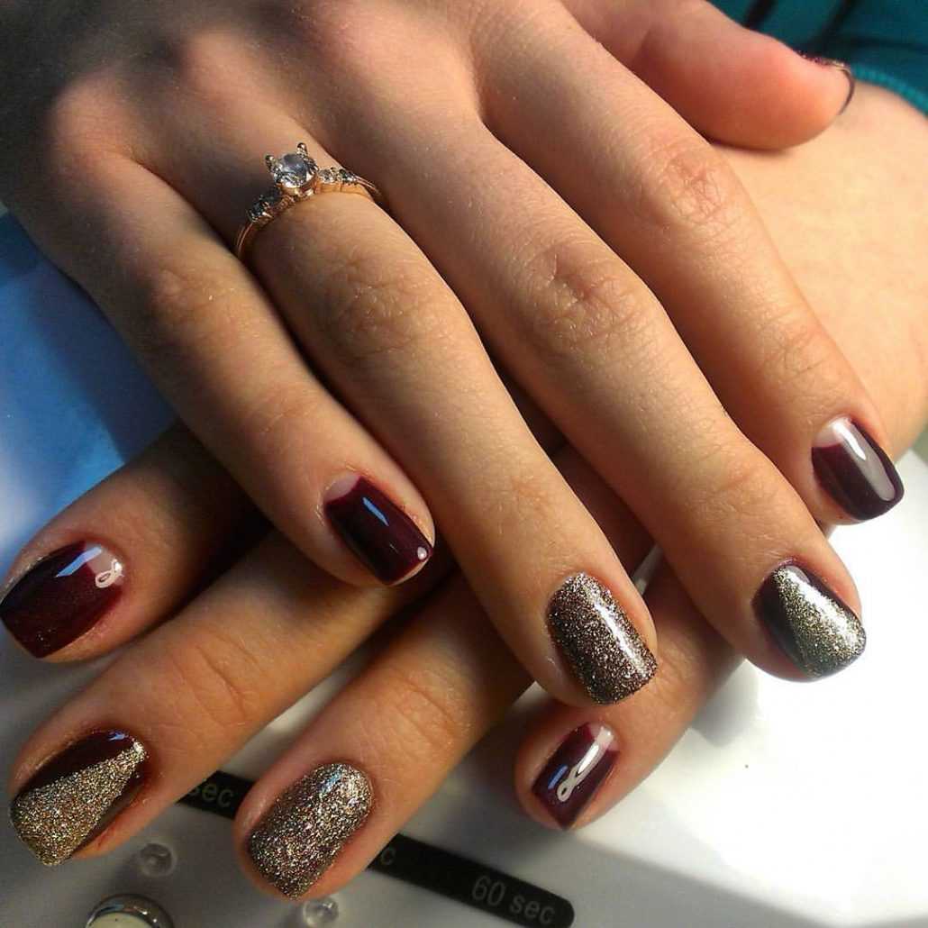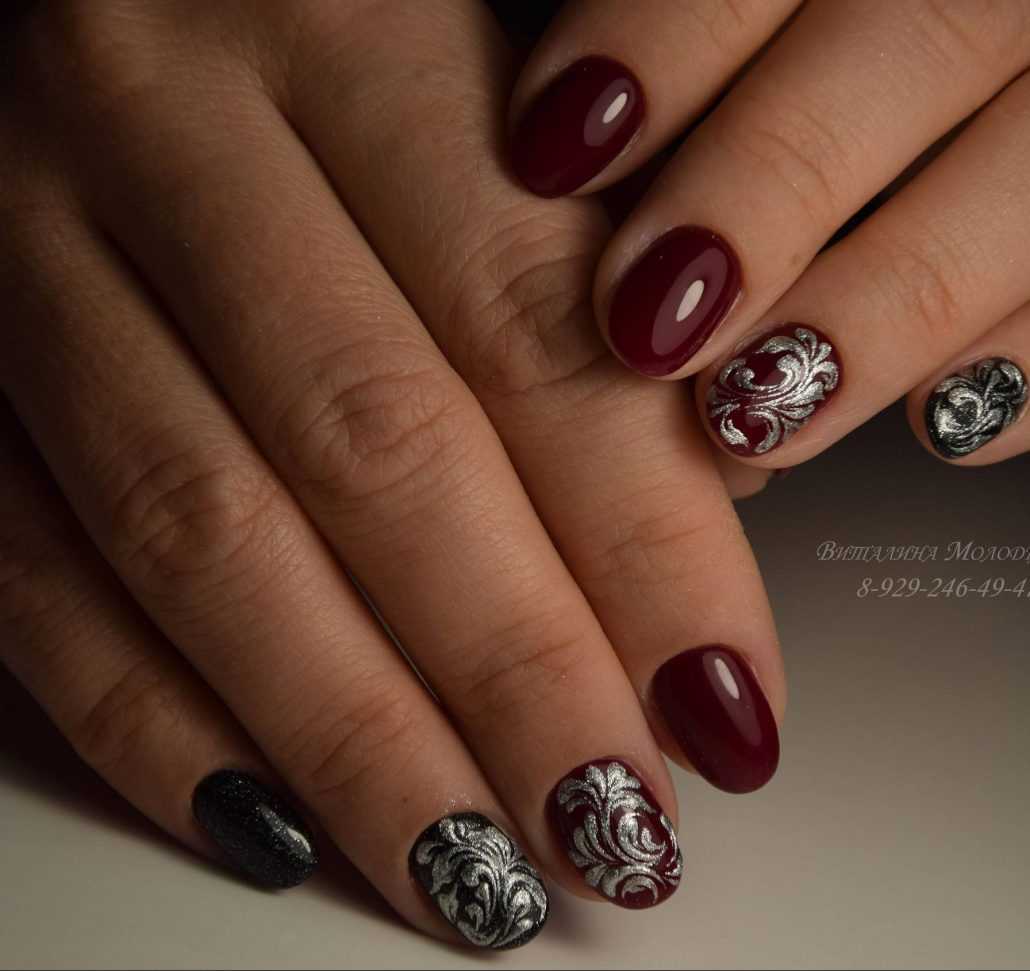 Сочетание бордового с серебром или золотом идеально для вечернего образа. Независимо от длины ногтя, маникюр будет выглядеть стильно и роскошно. Вариантов комбинации может быть много. Это может быть покрытие безымянного пальца золотым лаком, в то время как все остальные будут бордовыми. Золотистым можно украсить кончик бордового ноготка. А также можно нарисовать золотом любые рисунки на бордовом фоне.