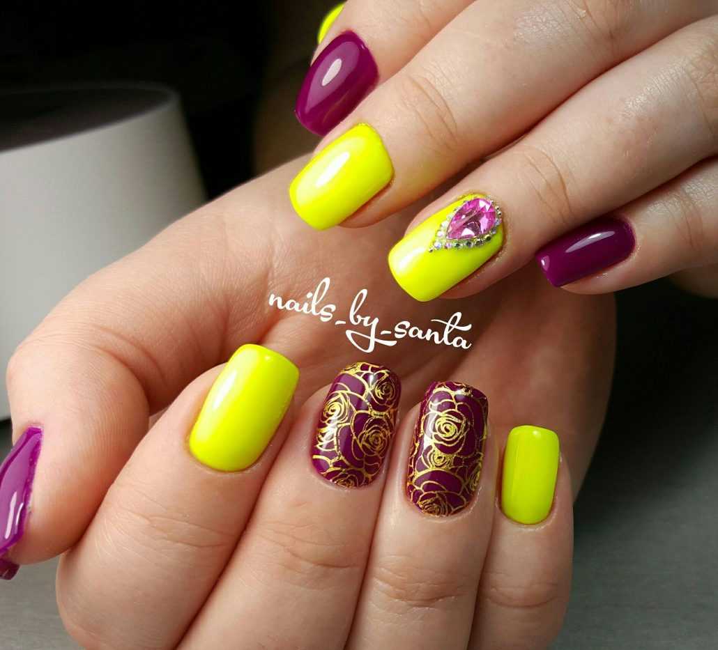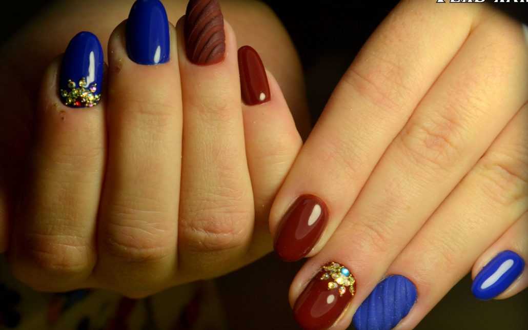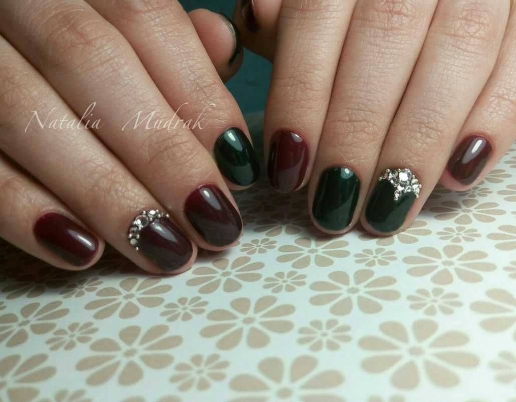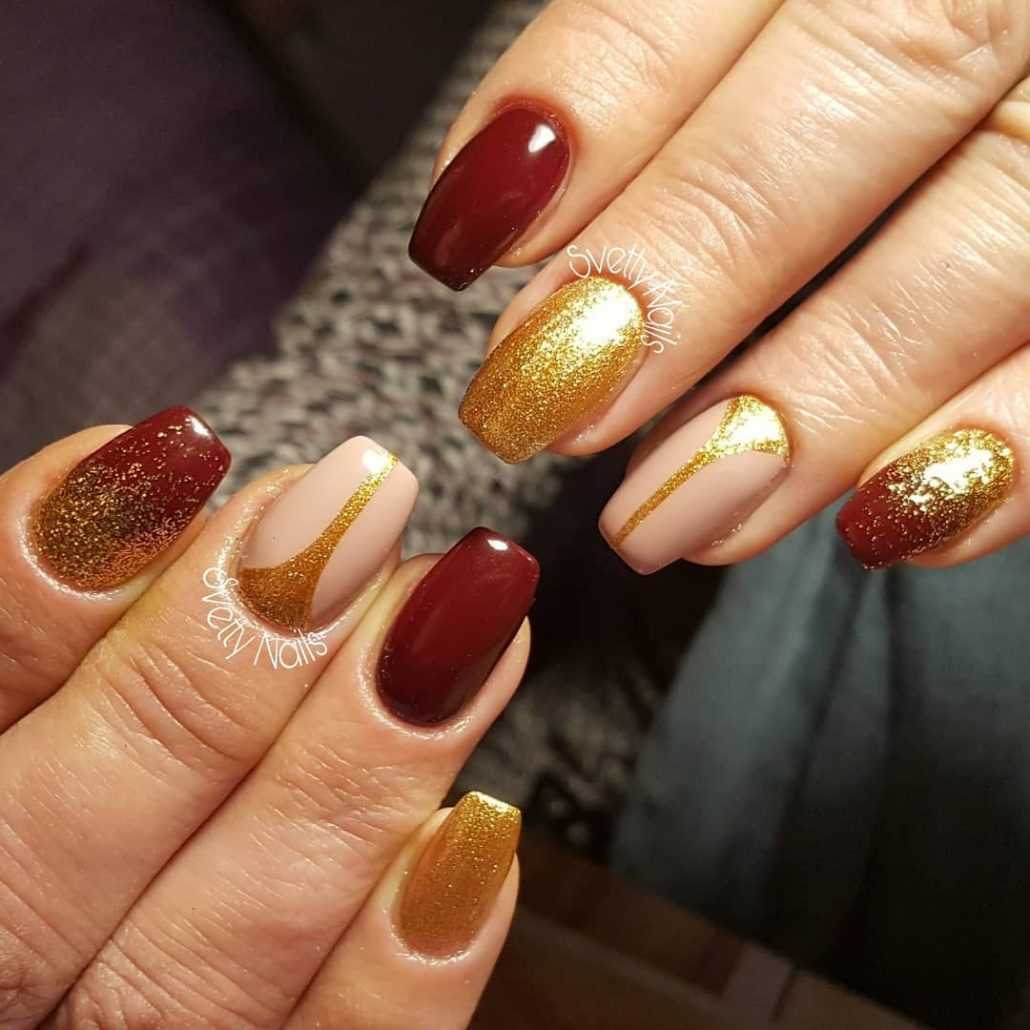 Сочетание бордового с серебром или золотом идеально для вечернего образа. Независимо от длины ногтя, маникюр будет выглядеть стильно и роскошно. Вариантов комбинации может быть много. Это может быть покрытие безымянного пальца золотым лаком, в то время как все остальные будут бордовыми. Золотистым можно украсить кончик бордового ноготка. А также можно нарисовать золотом любые рисунки на бордовом фоне.