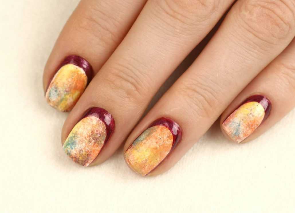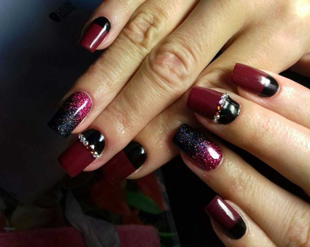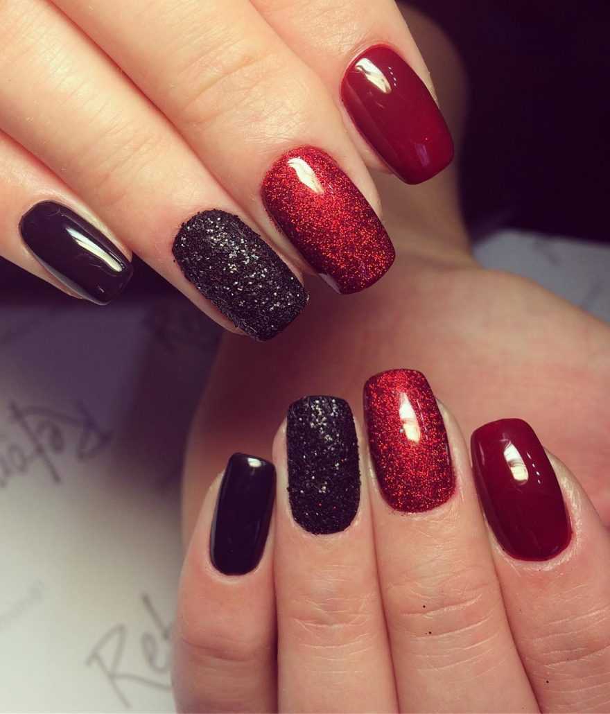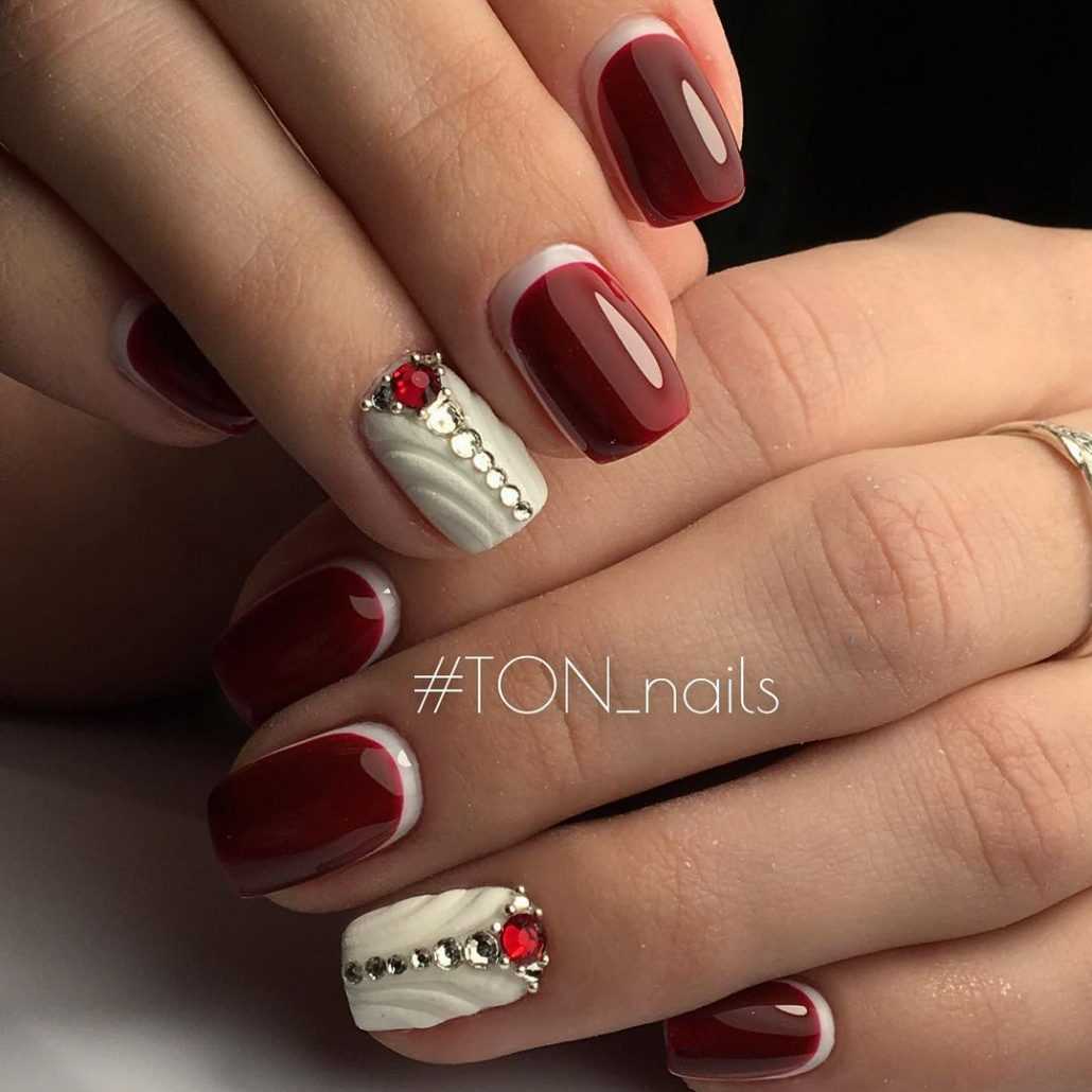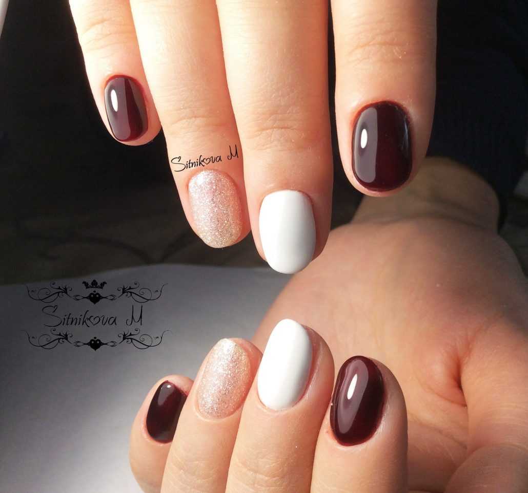 Дополнить насыщенность бордового могут разные оттенки. Прежде всего, это классические черный, белый и золотой. Украсить бордовый маникюр можно при помощи втирки, пудры или фольги.