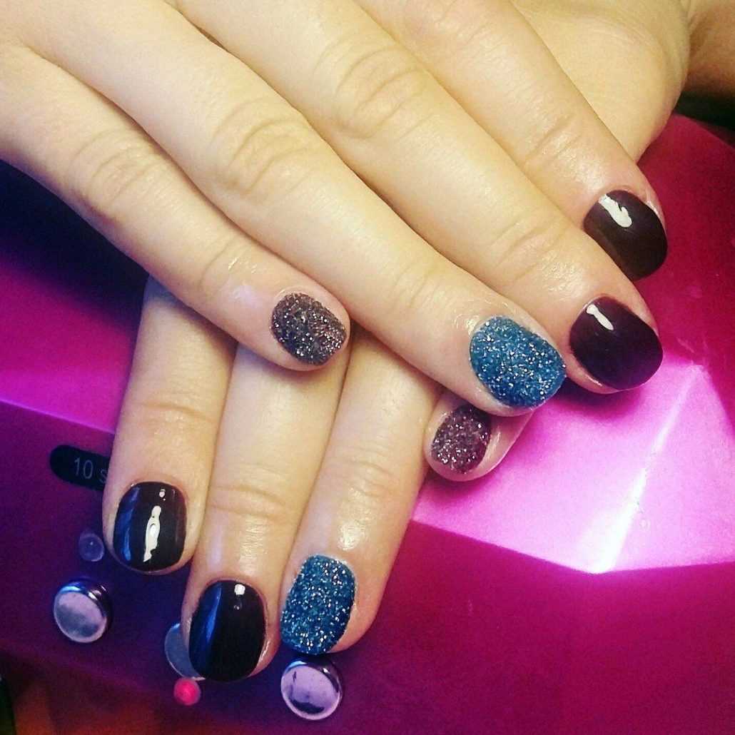 Шикарные переходы цветов на пальчиках – это один из стопроцентных способов привлечения внимания. Особенно хороши на ноготках контрастные сочетания. Лак в этом случае может плавно переходить в более тёмный и глубокий цвет, например, тёмно-бордовый, коричневый, чёрный, или, наоборот, в более светлый. В таком варианте блёстками следует выделить полностью один акцентный ноготок. Очень оригинально смотрится растяжка, выполненная непосредственно блестящими частичками. Нанесите декор на кончик или основание ноготка и аккуратно распределите блёстки по всей поверхности ногтевой пластины, оставляя на выбранном участке большее количество элементов. Декор может быть золотым, серебристым, синим, чёрным, сиреневым и любым другим.