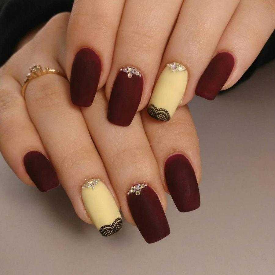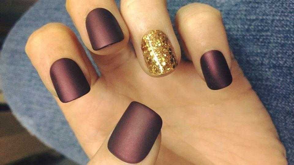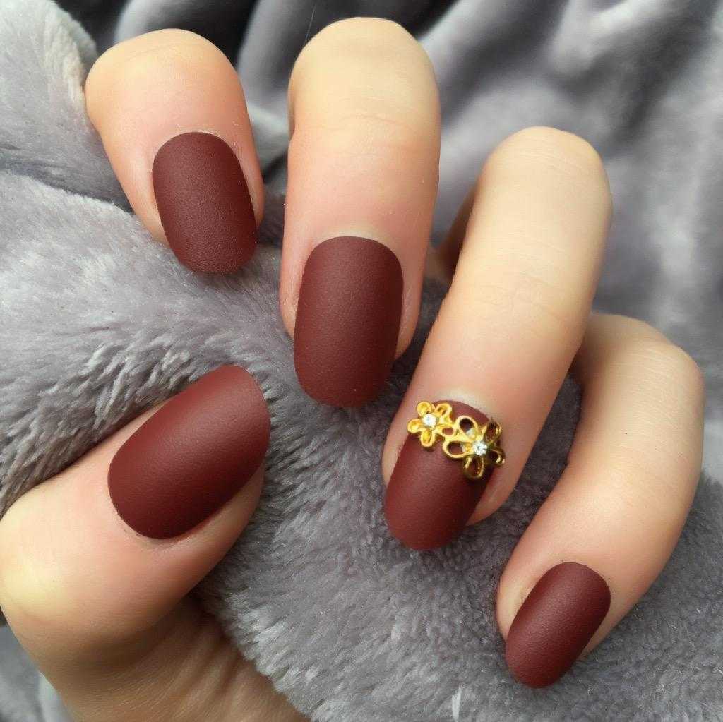 Матовый маникюр до сих пор смотрится необычно и интересно. Им можно покрыть все ногти, либо сделать акцент на нескольких пальцах. Красиво смотрится маникюр в цвете бордо, где все ногти покрашены в один оттенок, но безымянный и средний – матовые.