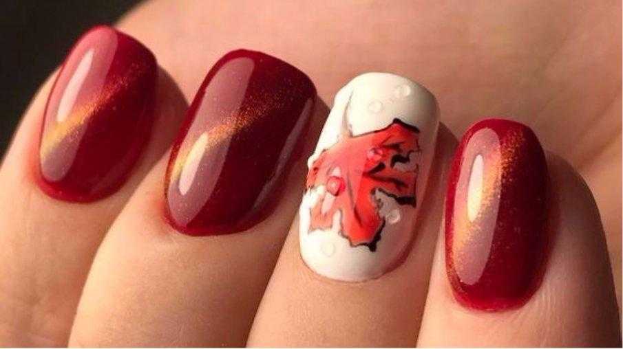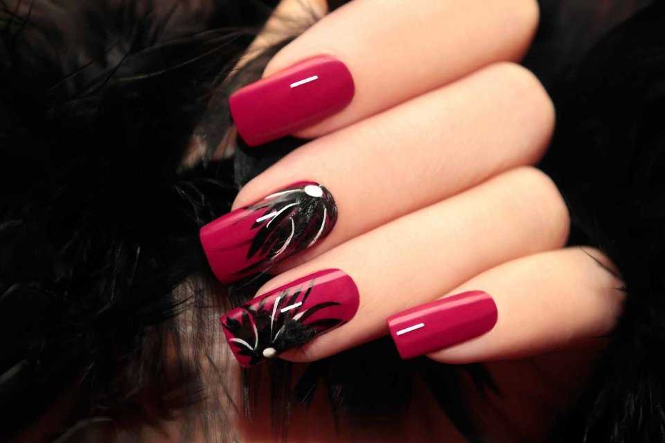 Если вы хотите выделиться среди друзей и коллег, вы можете перейти на бордовый маникюр с рисунком. Последний выбирается исходя из ваших личных предпочтений. Самыми популярными вариантами считаются цветочные мотивы, бабочки, геометрические узоры и модные абстракции.