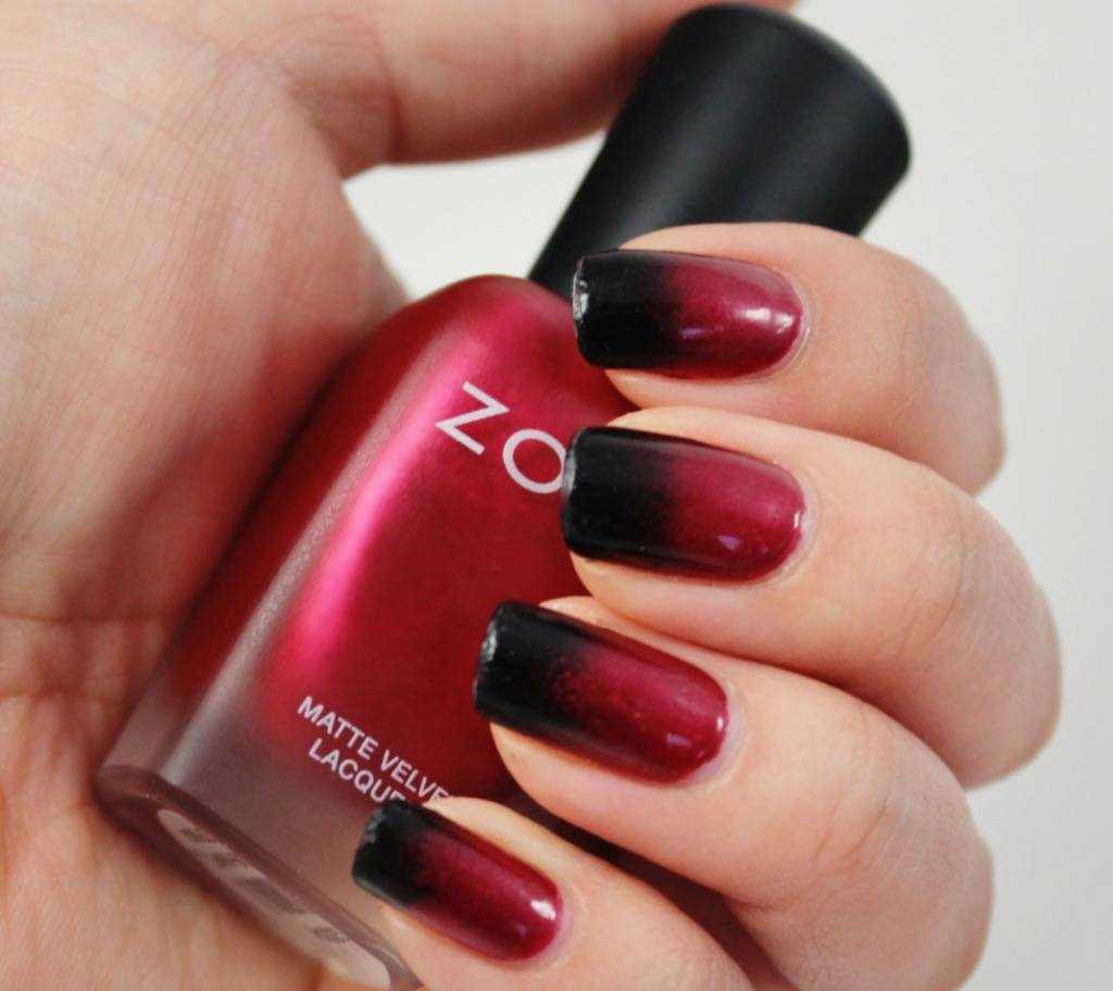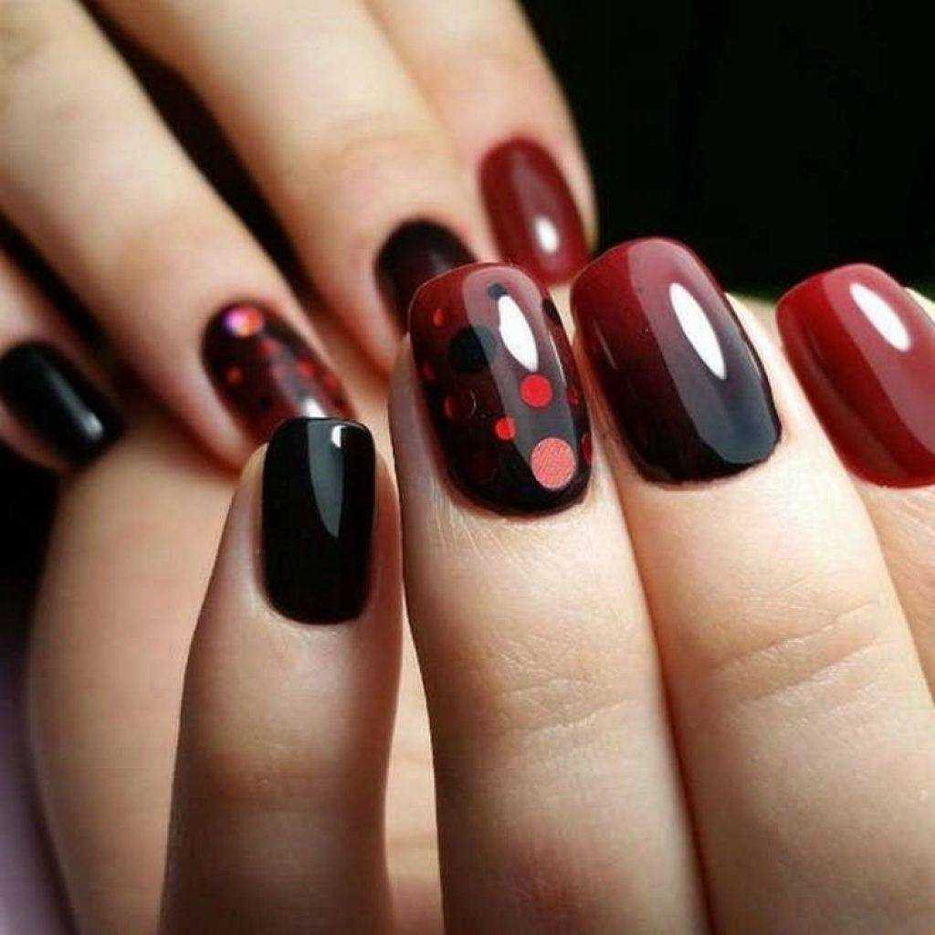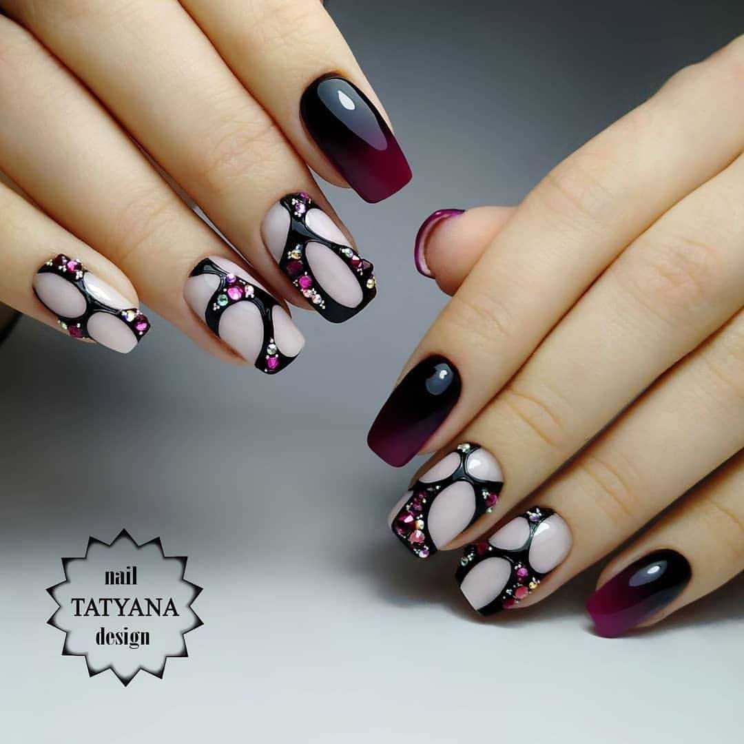Также шикарно выглядит градиентный маникюр с черным и бордовым. Черный используйте в прикорневой зоне и постепенно осветляйте его до светло-бордового цвета. В градиентном маникюре можно использовать незначительный декор стразами или бульонками.