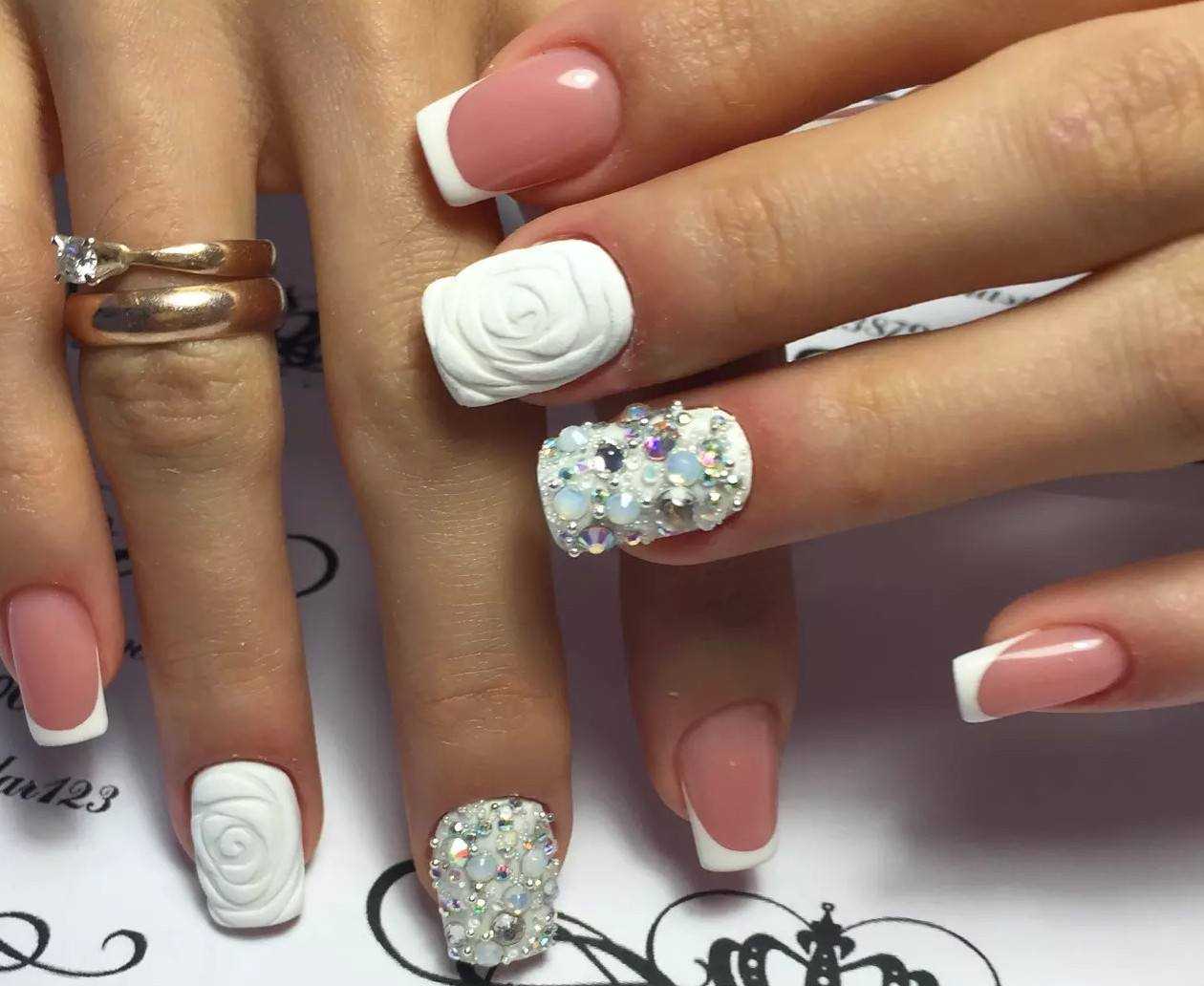 Немалую роль для такого события отводится и маникюру. Большинство мастеров предлагают девушкам для создания свадебного нейл-арта прекрасный и нежный френч. Такой скромный дизайн превращается в праздничный маникюр при помощи декора в виде цветов. Нежные лепесточки бутонов украшают ноготки, добавляют нежности и романтичности общему образу. Чаше всего французский маникюр с цветами выполняется в пастельном или белом покрытии. Для декора можно применять лепку, бульонки, стразы и любые другие элементы.