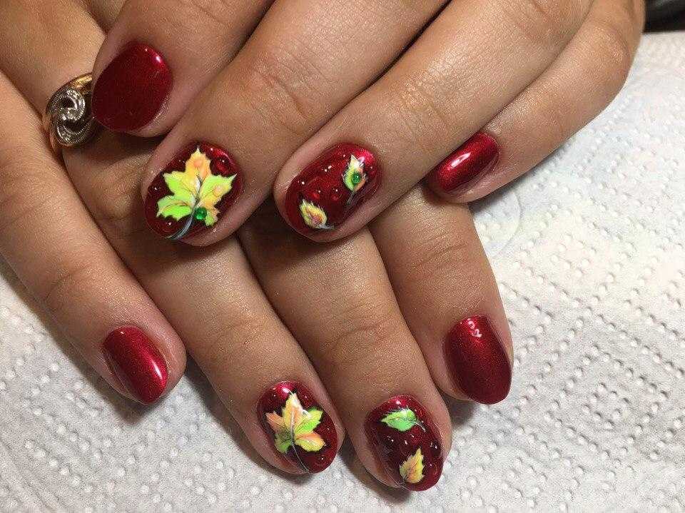 Конечно же, можно делать абстрактные, классические и цветочные дизайны, но все же самым популярным рисунком в осеннем маникюре являются листочки. Красные, желтые они изображаются в разных техниках и сочетаниях.