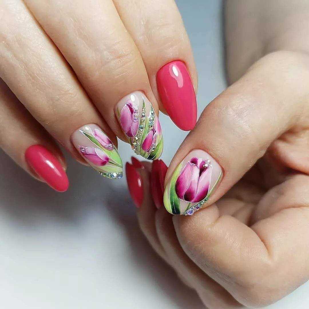 Бутоны тюльпана рисовать совсем не сложно, поэтому нейл-мастерам быстрее изобразить их с помощью маникюрной кисти, чем использовать наклейки. Помимо бутонов и самих цветов маникюр можно дополнить стебельками и листочками, украсить их небольшими камнями.