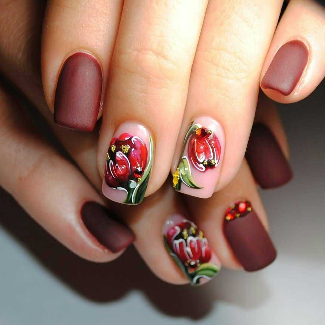 Маникюр с цветами в бордовых оттенках