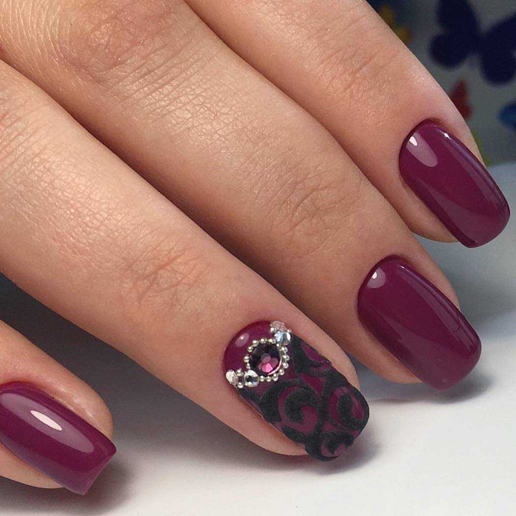 Тренд сезона – однотонное покрытие винным цветом и последующий декор черными стразами. Располагать декор лучше в прикорневой зоне. Выложите инкрустацию черными стразами или бульонками на нескольких ноготках.