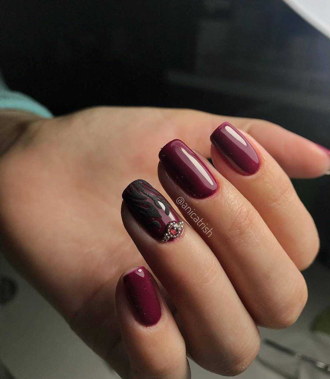 В зависимости от освещения такой маникюр может показаться почти черным или темно-красным. Сложный оттенок, который отлично уживается с любым видом дизайна.