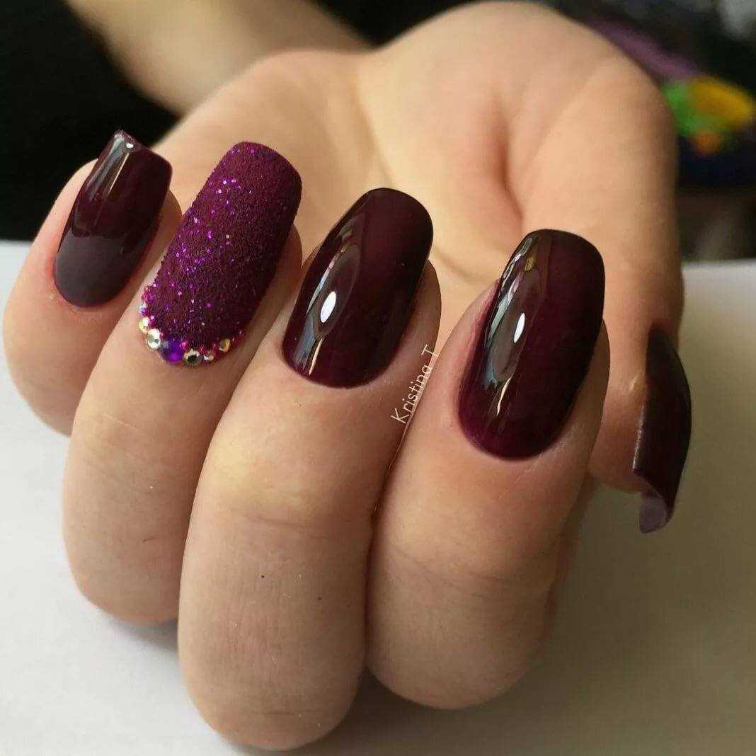 Модный дизайн бордового маникюра с блёстками