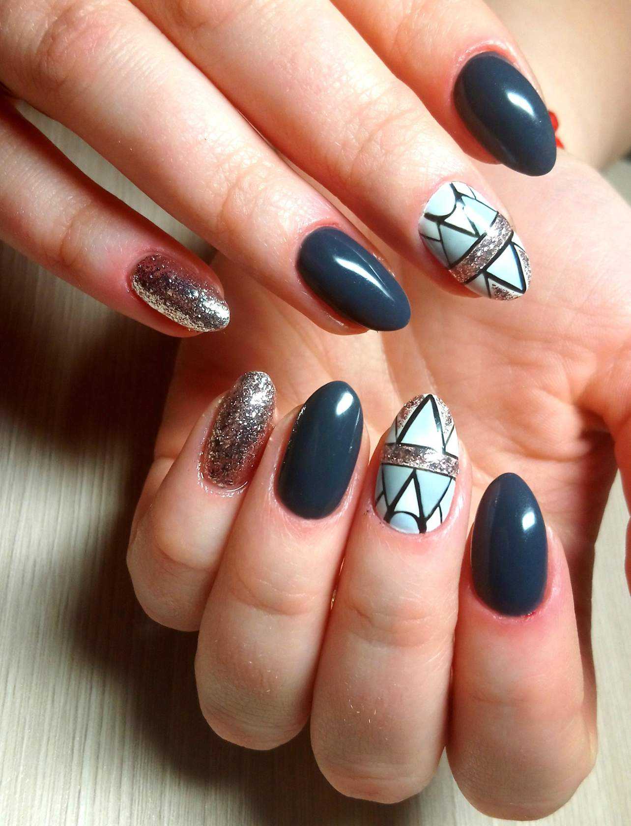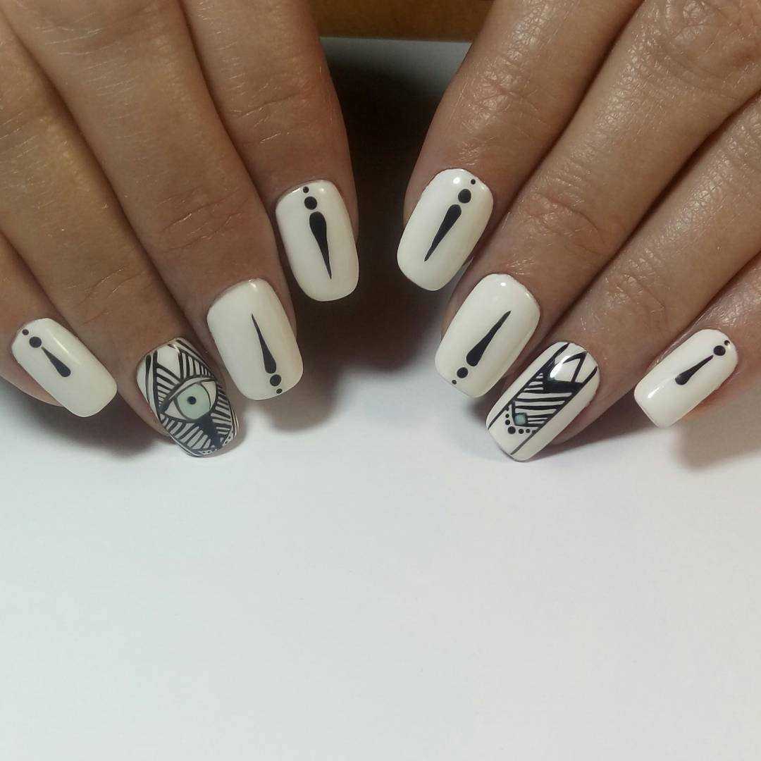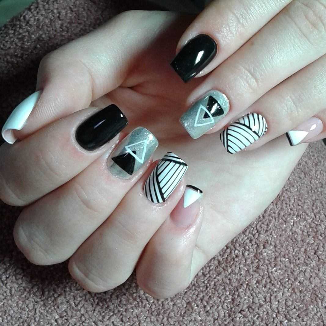 Различные геометрические рисунки на ногтях уже давно считаются признаком хорошего вкуса и стиля. К тому же это один из прекрасных способов выглядеть максимально современно. Подобная техника подразумевает не только наличие полос и зигзагов, но и создание «неправильных» узоров и смелых форм. Можно оформить на каждом ноготке индивидуальный рисунок, а можно использовать конкретные изображения. Здесь всё зависит от вашего настроения и вкусовых пристрастий. Блёстки и различные украшения в качестве дополнения только дополнят чёрно-белую геометрию нотками шарма.