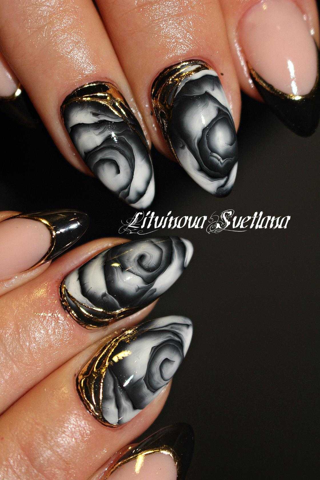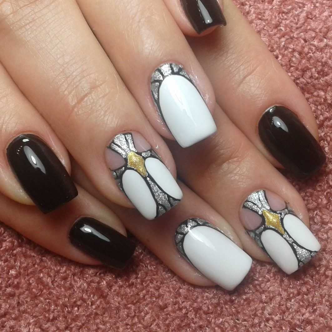 Чёрно-белые ноготки с золотом и серебром
