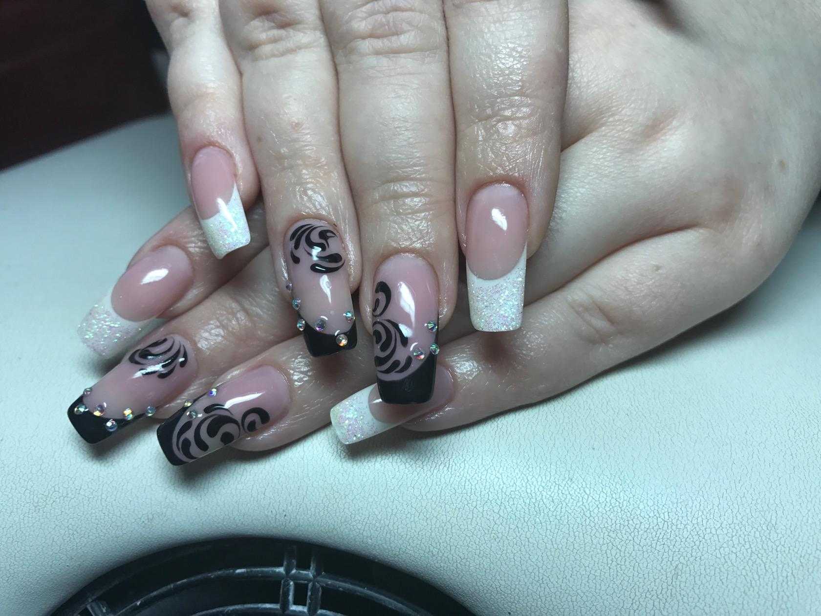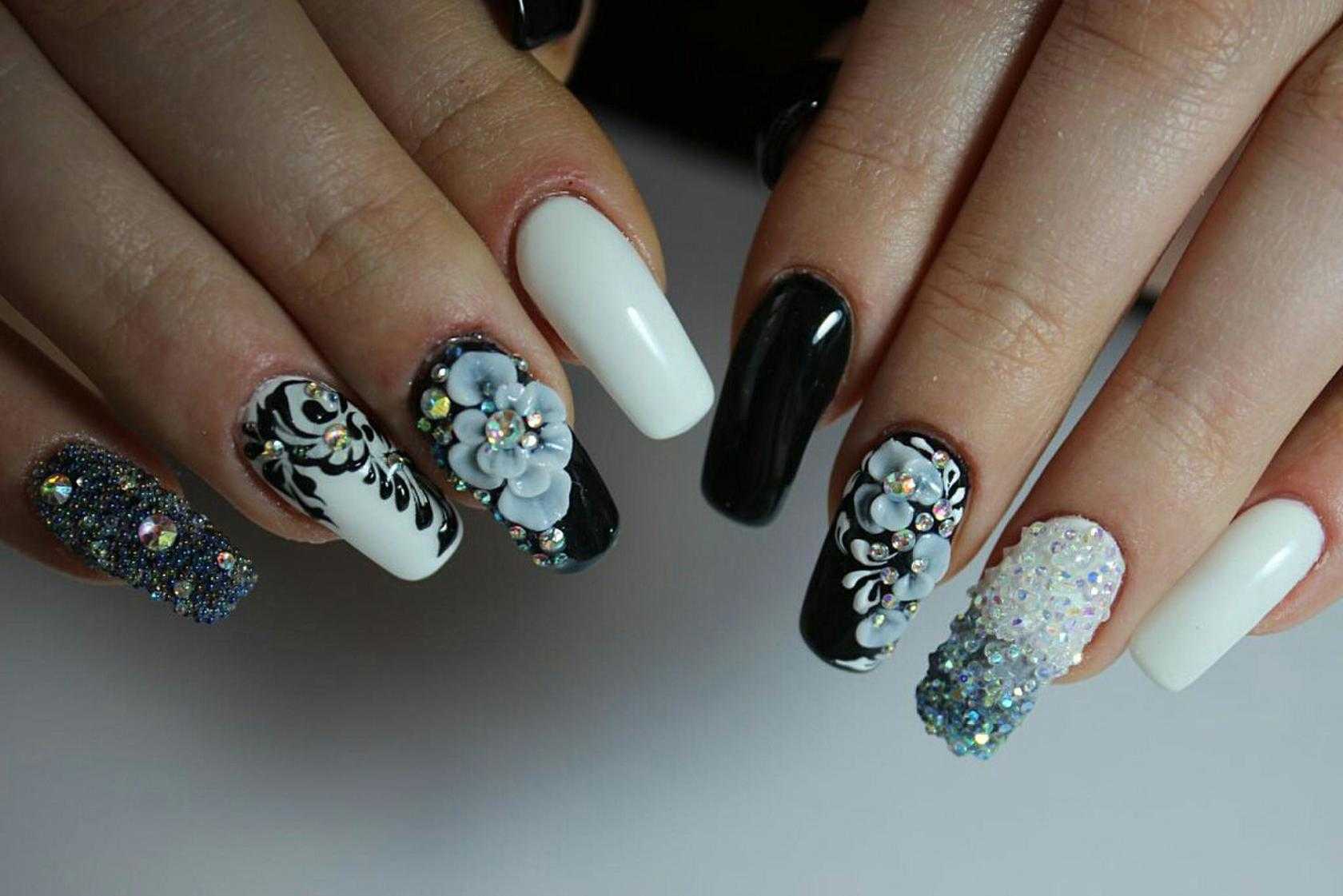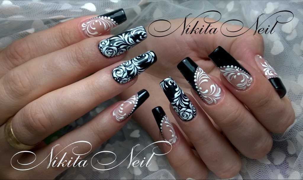 Барышням с длинными ноготками предоставляется немного больше возможностей, ведь площадь пластины позволяет не ограничивать себя при выборе дизайна. В 2021 году среди модных вариаций чёрно-белого нейл-арта можно выделить контрастные вариации французского маникюра, оригинальные идеи анималистичного дизайна, выделение кончиков ногтевых пластин ажурными узорами, а также геометрические композиции, абстрактные узоры с блестящими акцентами и идеи оформления с рисунками и украшениями в виде страз либо бульонок. При этом оба цвета прекрасно дополняют и заменяют друг друга в качестве основного фона, благодаря чему можно варьировать акцентный цвет по своему усмотрению.