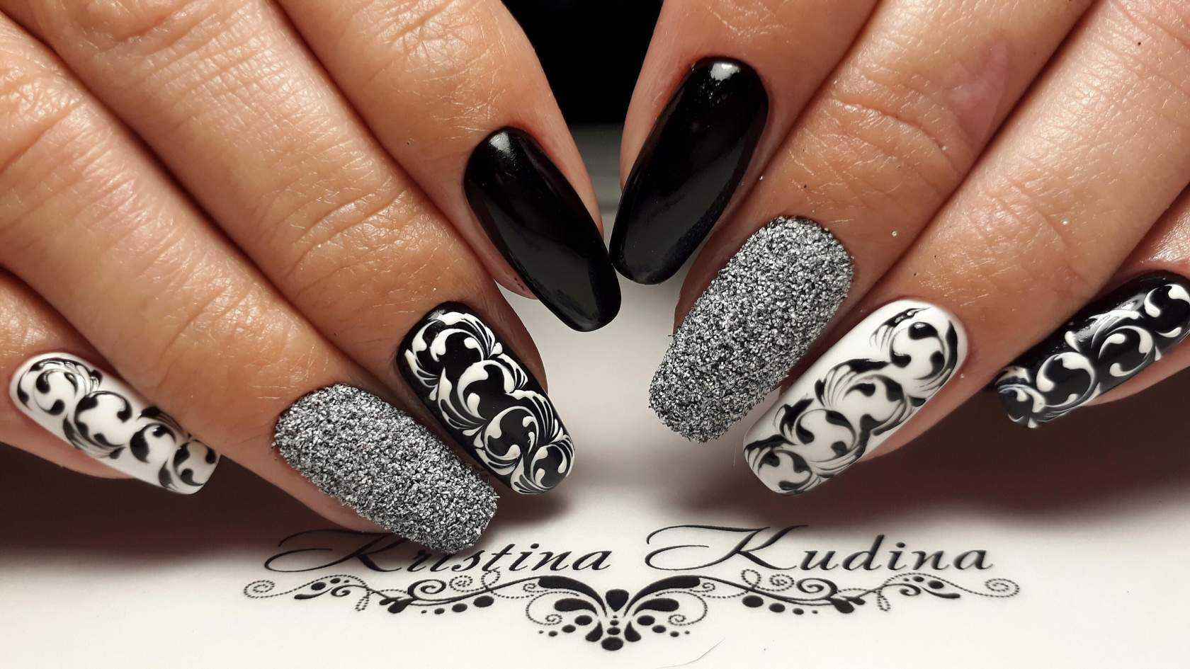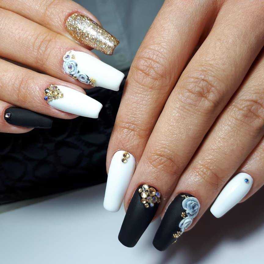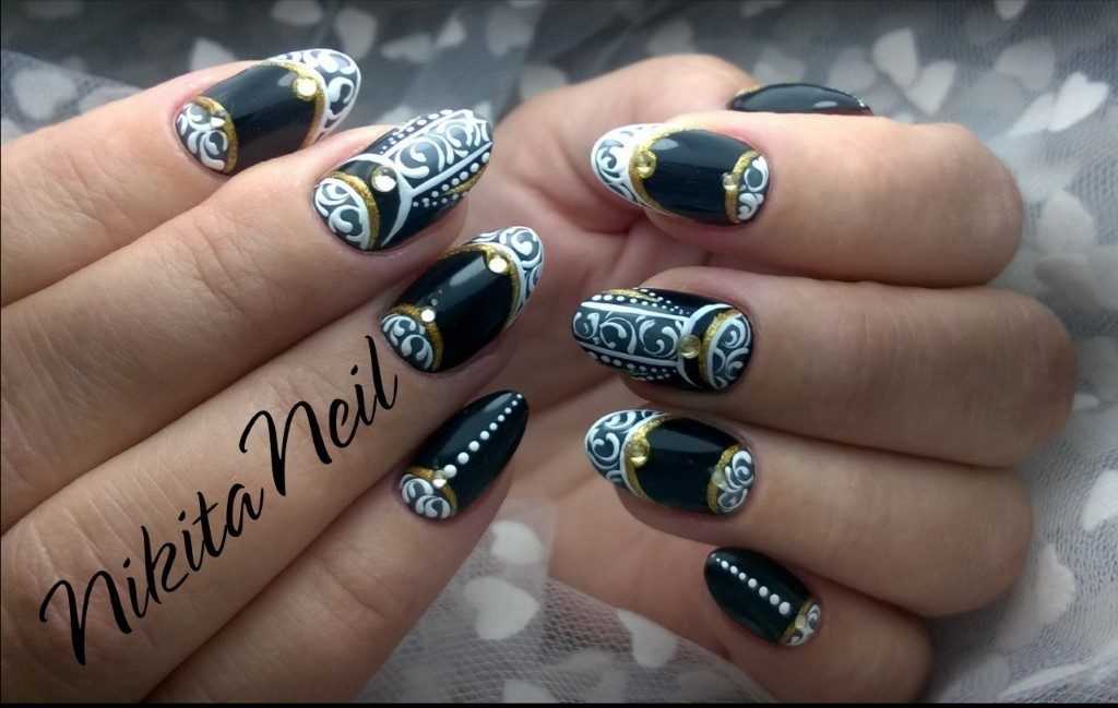 Идея дополнения чёрно-белых ноготков серебристыми или золотистыми деталями считается одной из самых популярных в нейл-дизайне. Это решение позволяет сгладить контрастность между цветами и смотрится просто потрясающе. Использоваться при этом могут различные элементы декора, поэтому разнообразие вариаций подобного дизайна приятно впечатлит любую барышню. При использовании блёсток глиттера золотистого или серебристого цвета, можно прорисовать любые детали рисунков, обозначить границу геометрических фигур, выделить лунулы или создать на покрытие блестящую растяжку. Не менее шикарно смотрятся металлизированные полоски и оттиски фольги, а также оригинальные камифубуки, бусины и кристаллы. Главное правило – всего должно быть в меру. Наша цель – это изысканное сияние. Поэтому лишний пафос и театральность лучше оставить для тематических вечеринок.