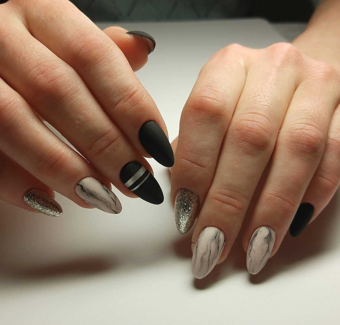 Уже пару лет подряд трендом считается матовый маникюр. Довольно интересно он смотрится, когда хотя бы один ноготок покрыт черным лаковым покрытием и укреплен бархатным топом. В 2020 году особой популярностью пользуются геометрические фигуры и мраморный орнамент. В виде дополнений таких техник мастера используют золотистые полосы или мелкие частицы глиттера.
