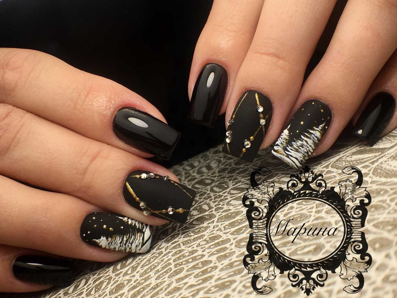Среди актуальных идей потрясающие вариации френча, оригинальные идеи с геометрическими элементами и шикарный маникюр с декором из страз, чёрно-белые ноготки с серебристыми и золотистыми дополнениями, а также потрясающие примеры оформления бархатистого покрытия. При этом ваш нарядный маникюр совсем не зависит от длины ногтей. Вы без труда подберёте идеальный вариант для своих пальчиков и любого образа.