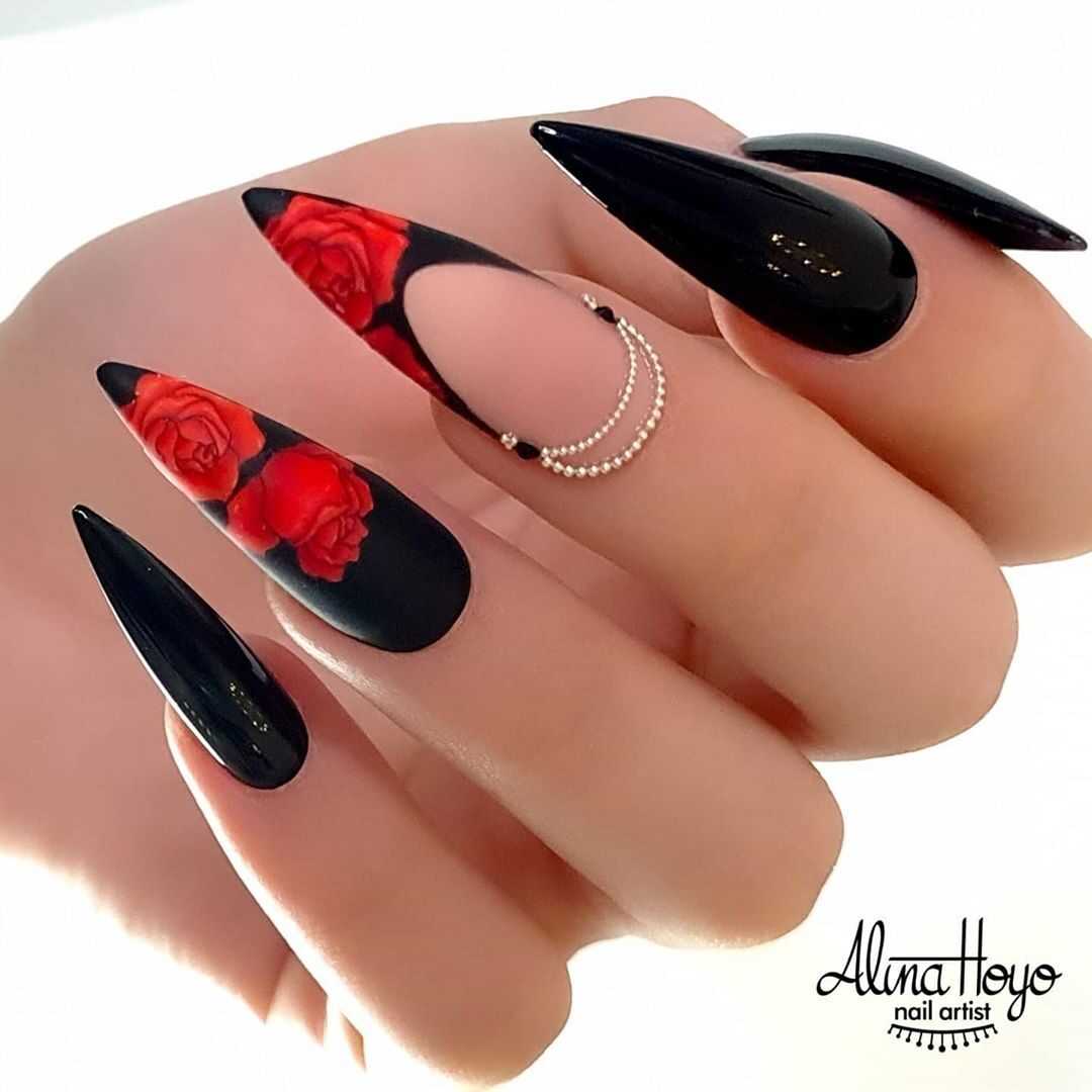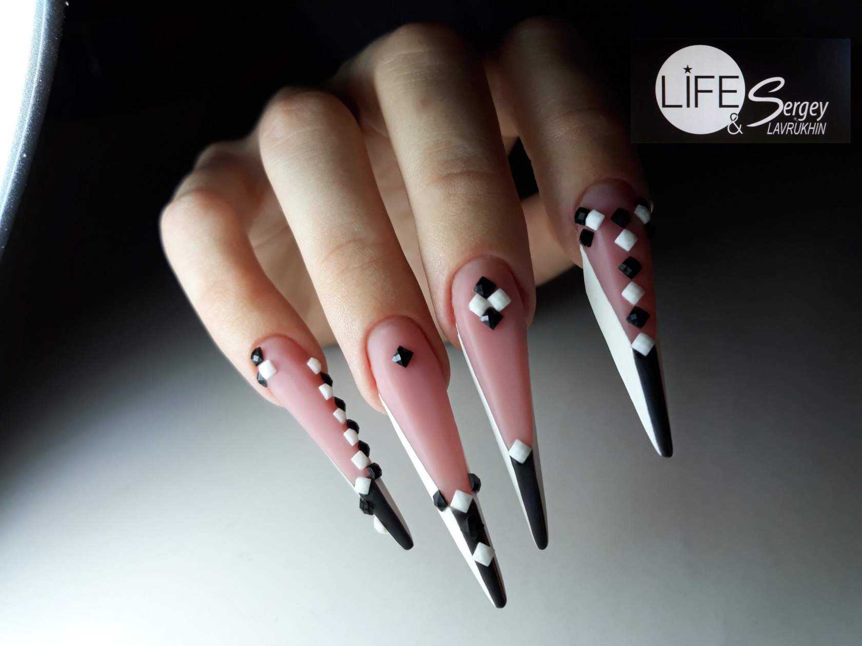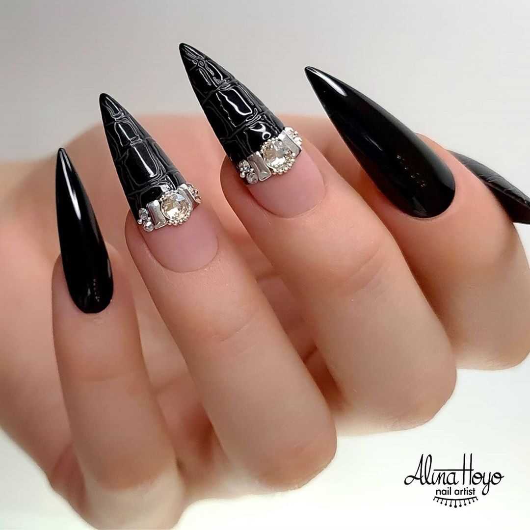 Несмотря на то, что длинные ногтевые пластины всегда сопровождаются массой положительных отзывов, их сочетание с чёрным лаком стоит выбирать смелым особам. Особенно если речь идёт о заострённой форме. Также следует обязательно разбавлять и сглаживать дизайн при помощи декоративных украшений или рисунков, выполненных более мягкими и нейтральными оттенками, например, бежевым или белым.