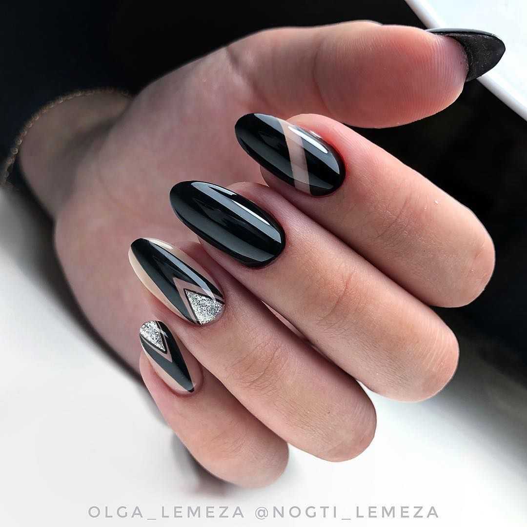 - Геометрия. Упорядоченные и хаотичные геометрические фигуры уже много сезонов не выходят из моды. Дизайн выполняется в минималистическом стиле. Именно глубина черного дает приятную лаконичность, естественность. Универсальный маникюр, подходит на все случаи жизни.