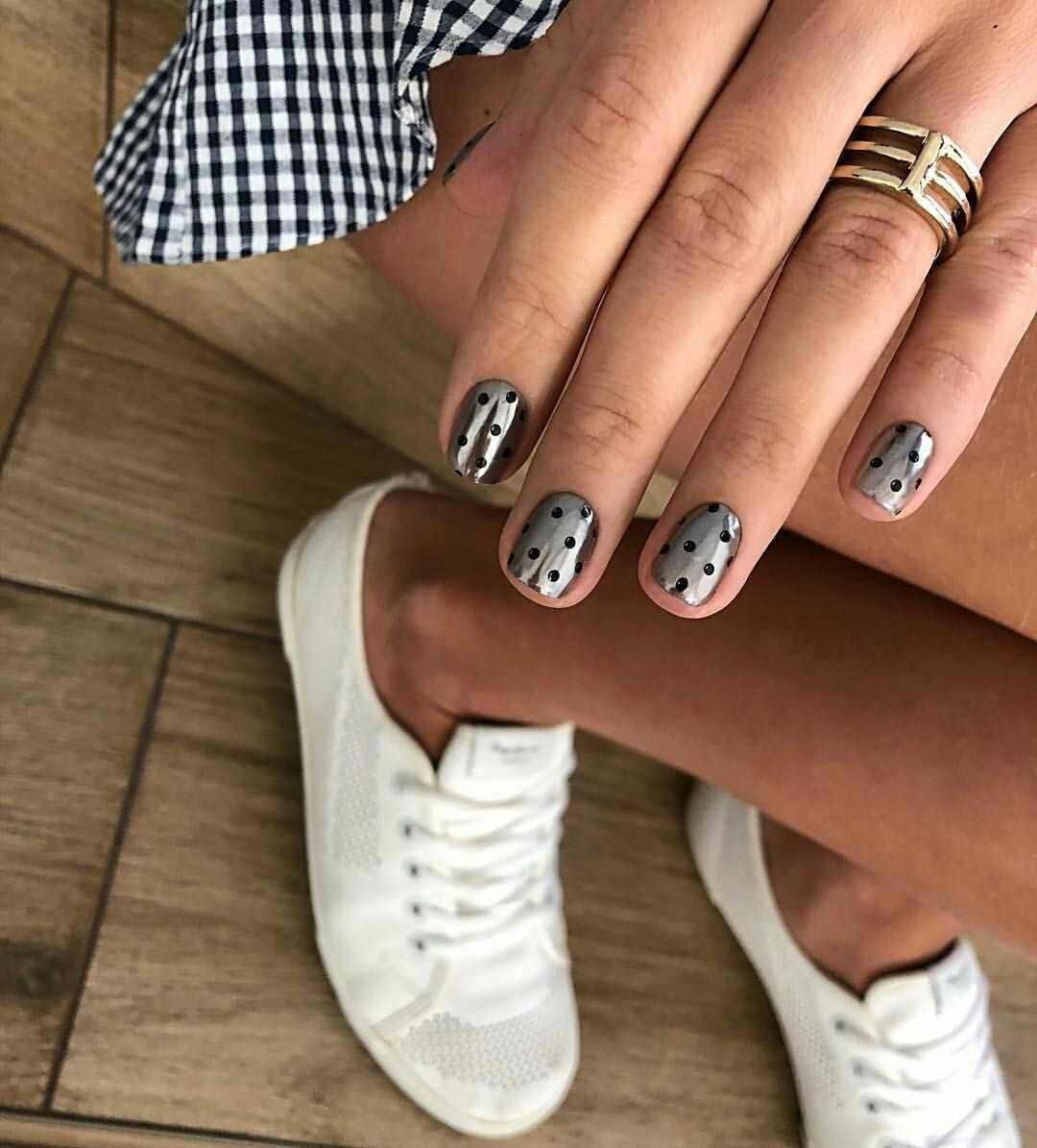 Нельзя не упомянуть об одном из главных трендов в мире подиумной моды. К нам возвращается горох! Этот принт был забыт на несколько сезонов, но вновь вернулся и стал главным козырем модного сезона весна – лето 2019. Модные тенденции этого года предусматривают, что горох будет актуален в качестве принта для летнего платья и даже для делового костюма. А чтобы образ был законченным, нарисуем “гороховый” принт и на ноготках.