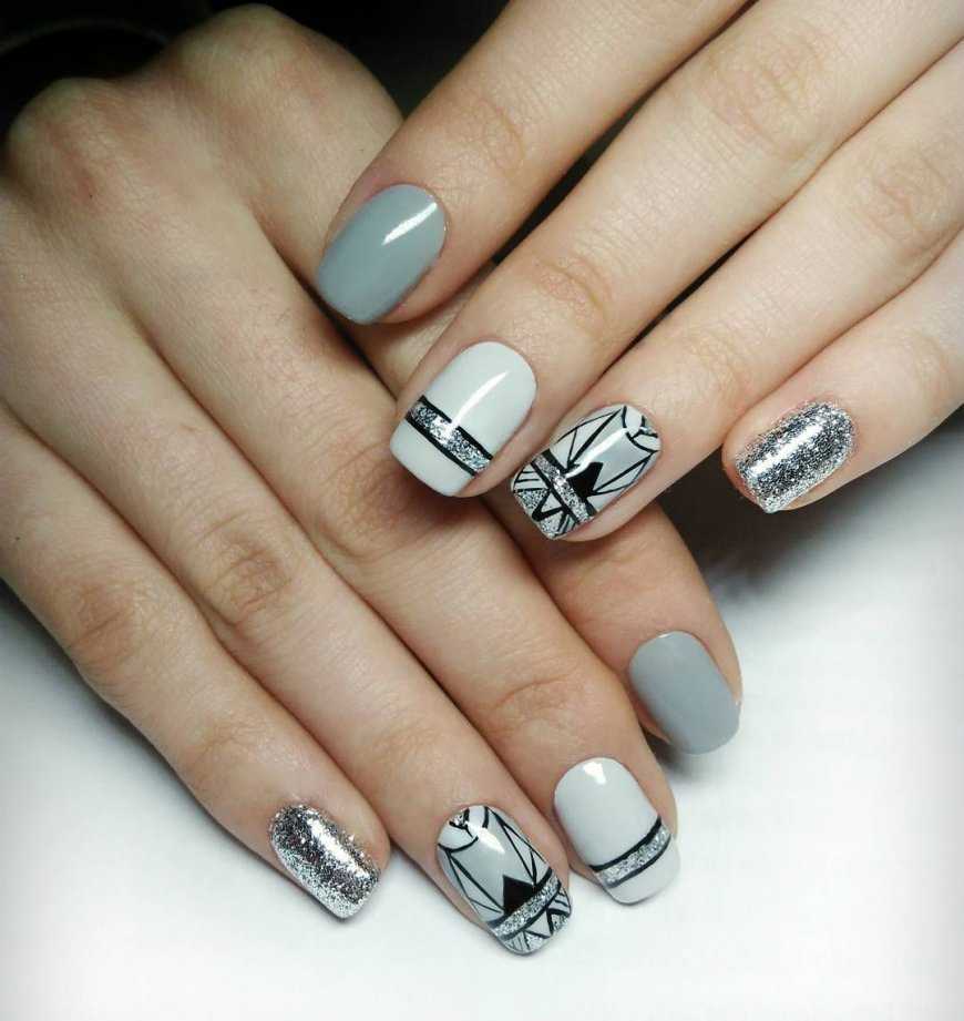 - Маникюр с геометрическими рисунками шеллаком, один из самых востребованный в женских деловых кругах.