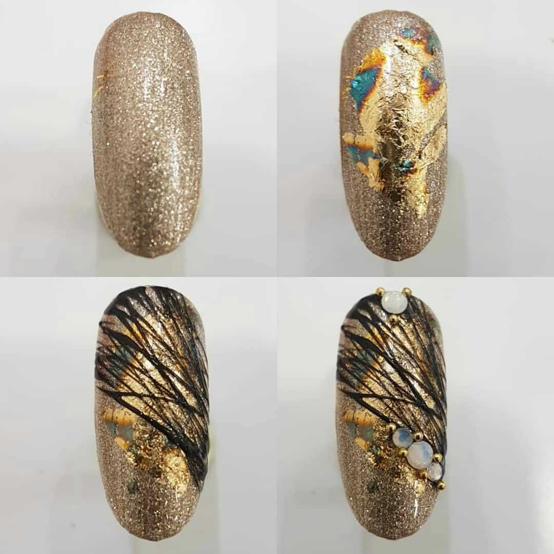 Такие ленты могут располагаться на ногте хаотично, а могут формировать геометрический узор. Сам цвет шеллака может быть любым. И если вы не знаете какой цвет ленты подобрать, то лучше использовать ленту с металлическим оттенком, ведь именно она сможет подойти к любому цвету шеллака.