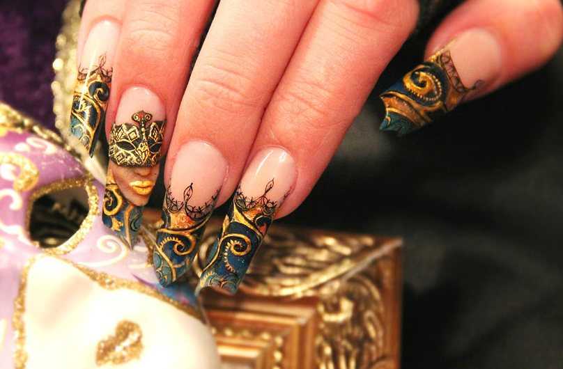 Особое внимание отдается сочетаниям черного, красного и белого лакового покрытия. Также оригинально смотрится невероятный контраст синего и серого, пудрового и голубого, розового и желтого оттенков
