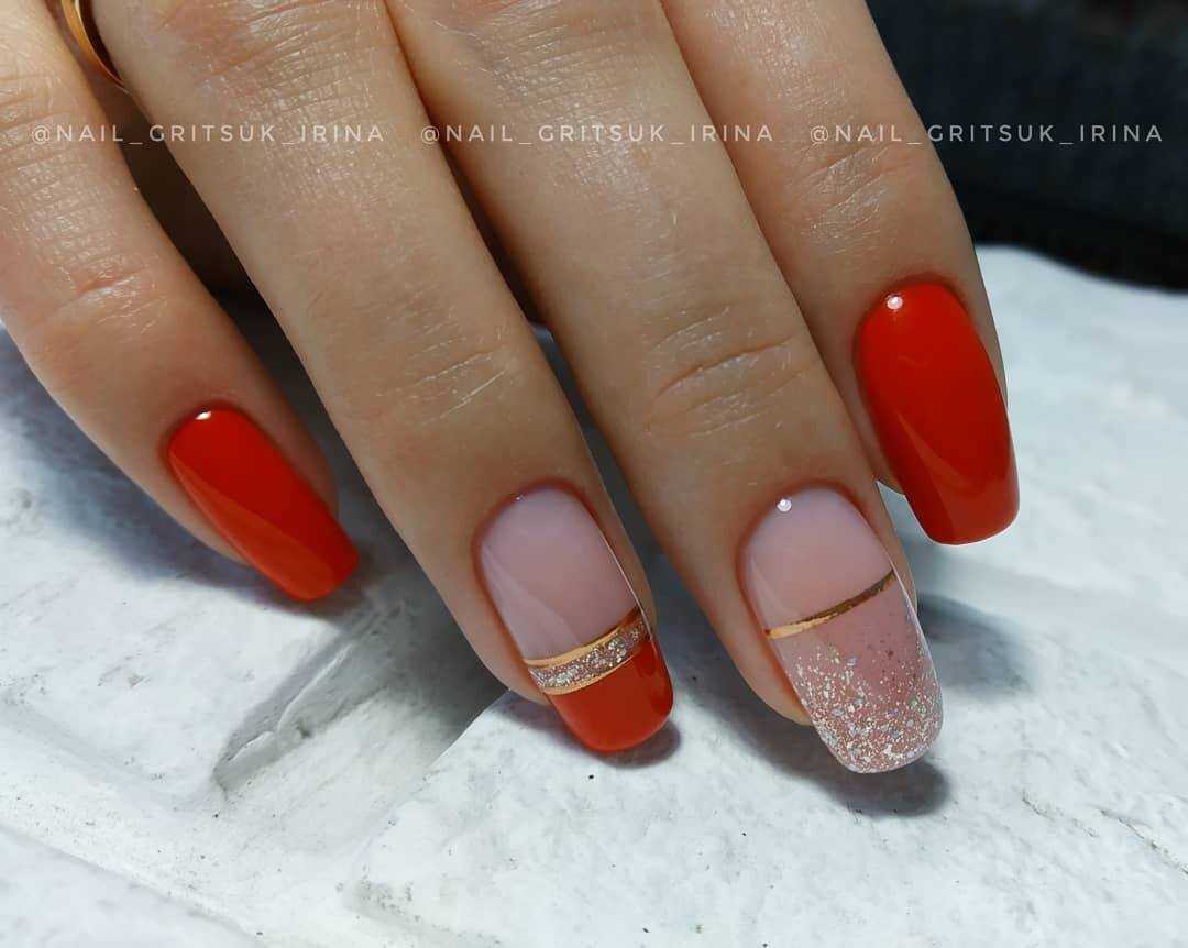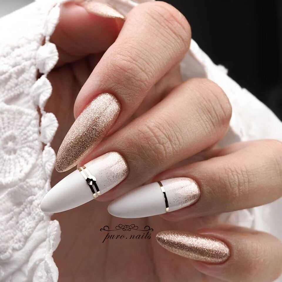 Многие мастера маникюра любят экспериментировать с цветовыми гаммами. К примеру, в некоторых случаях каждый ноготок имеет сразу два оттенка, которые между собою имеют разделительную грань. Ее выполнят при помощи золотистых лент. Также интересно и необычно дополняют друг друга оба оттенка при помощи рисунка в виде геометрической фигуры. Кстати такой чудо орнамент можно сделать в третьем цвете.