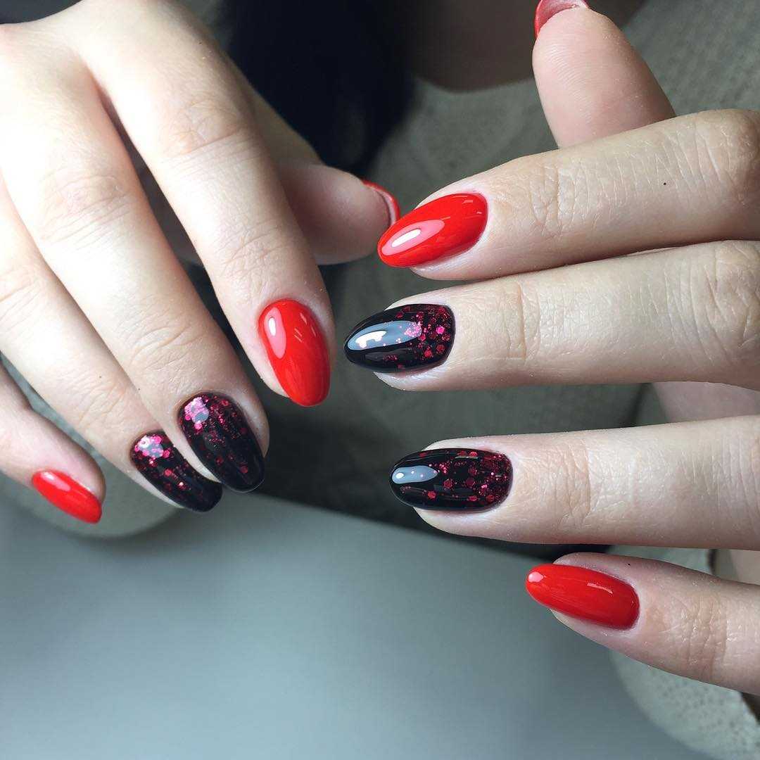 Красно-чёрные ноготочки не только прекрасно украшают пальчики, но и чудесно уживаются по соседству с разнообразным дизайном. Вы можете полностью покрыть пластины одним из цветов и нанести рисунок противоположным оттенком. Можете разнообразить дизайн дополнительными тонами, золотыми или серебристыми нотками, украсить акцентные пальчики бусинами, глиттером, элементами фольги, хлопьями Юки или конфетти в тон лака. Уместно комбинировать между собой несколько техник, например, оформить один-два пальчика в монохромном маникюре негативным пространством или бархатный матовый топ дополнить глянцевым лаком.