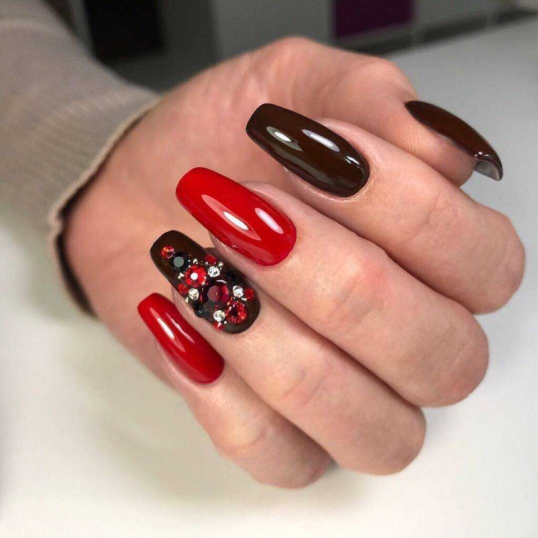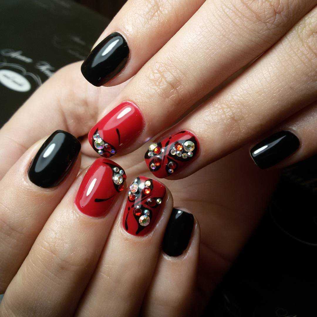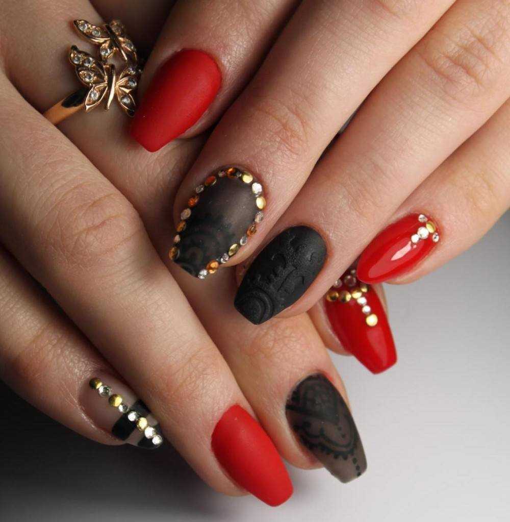 Матовый маникюр с блёстками, рисунки, оригинальные вариации френча, сочетание на ноготках страз и блёсток, великолепный омбре и многие другие примеры находятся сегодня в списке самых трендовых идей красно-чёрного маникюра. Далее об этом и многом другом более подробно.