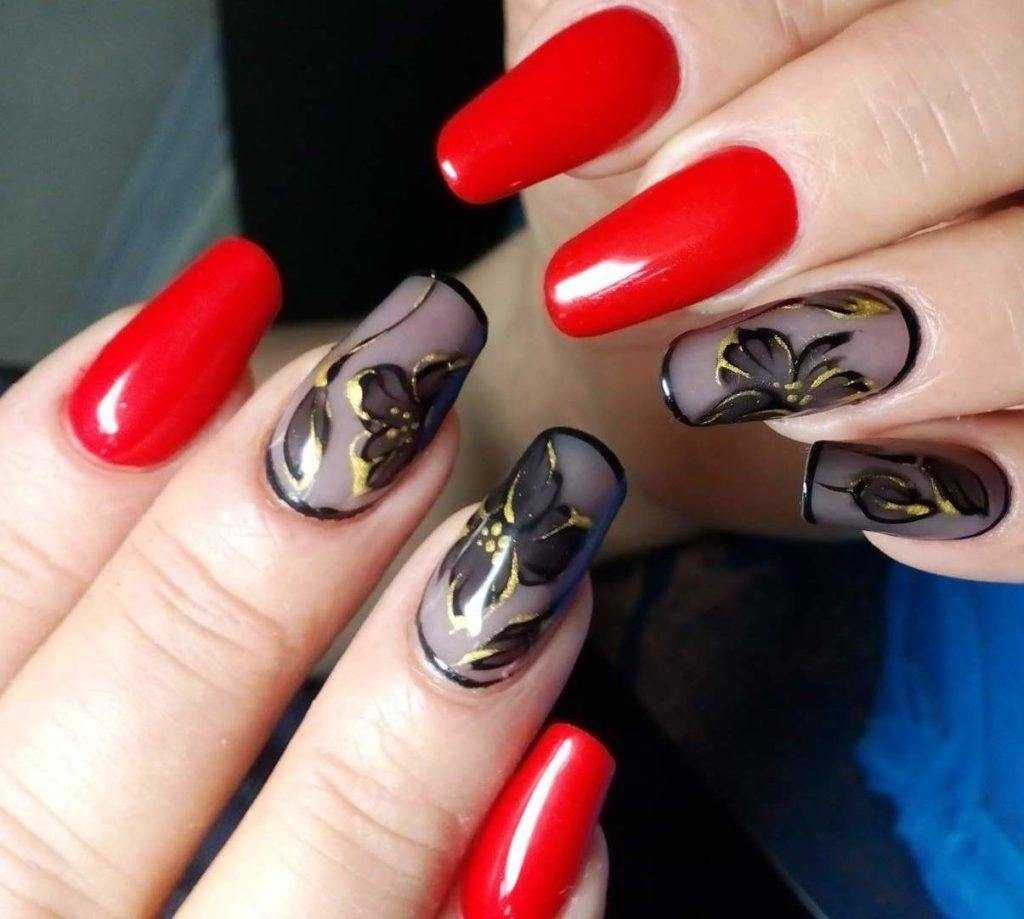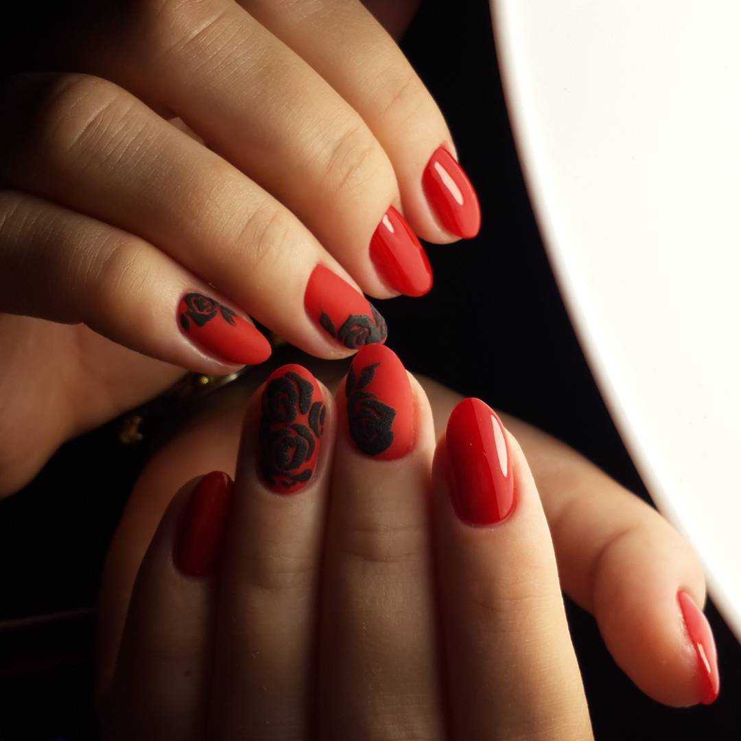 Не смотря на выразительность красного и чёрного лака, они очень женственно смотрятся в компании с различными цветочными рисунками. При этом особое предпочтение отдаётся чёрным изображениям на красной основе или красным рисункам на чёрных ноготках