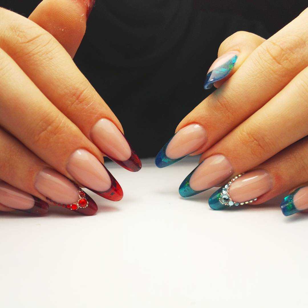 Французский маникюр отлично смотрится на длинных ноготках, особенно если они имеют миндалевидную форму. От длины зависит полнота дизайна. Ведь именно на длинных миндалевидных ноготках можно, так сказать, «разгуляться». Но стоит помнить, что край френча не должен быть слишком свободным. Это может еще больше удлинить ногтевую пластину, тем самым испортить весь дизайн. Идеальным вариантом для декора френча на длинных ноготках может послужить цветная роспись или дизайнерская абстракция. Главное правильно подобрать цветовые оттенки, чтобы они строго гармонировали с женственным образом.