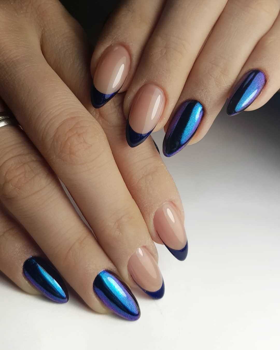 Совмещение разных цветов, самый модный вариант — синий на ногтях одной руки, красный — на второй.