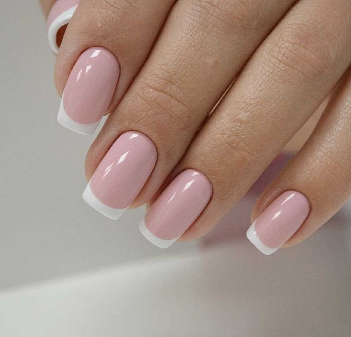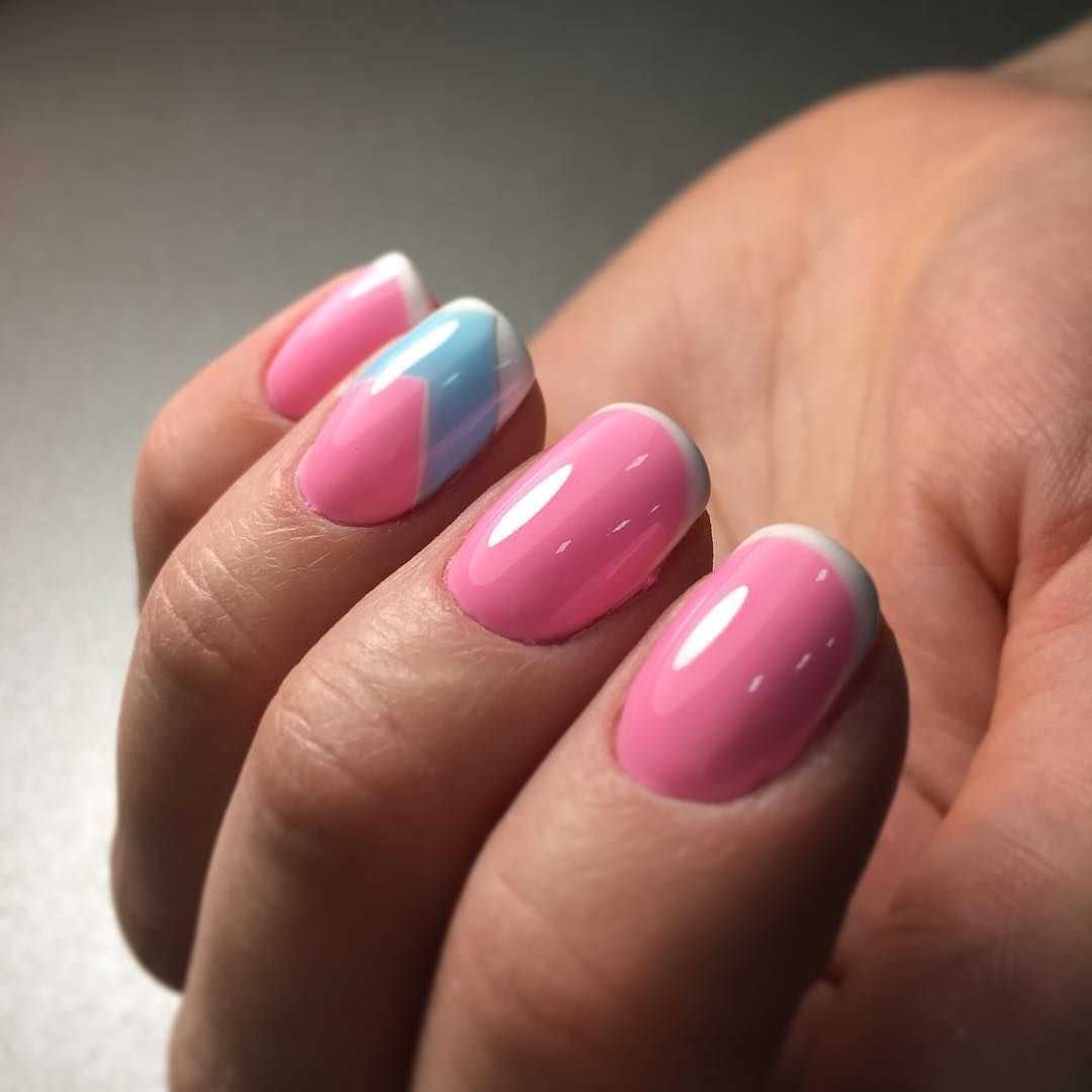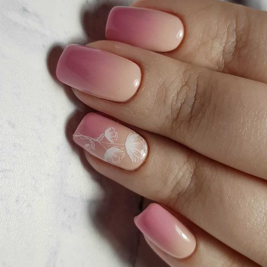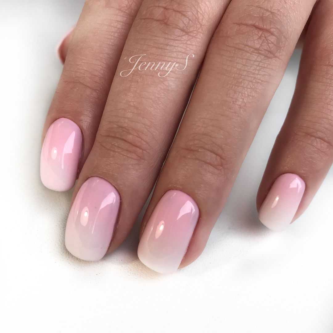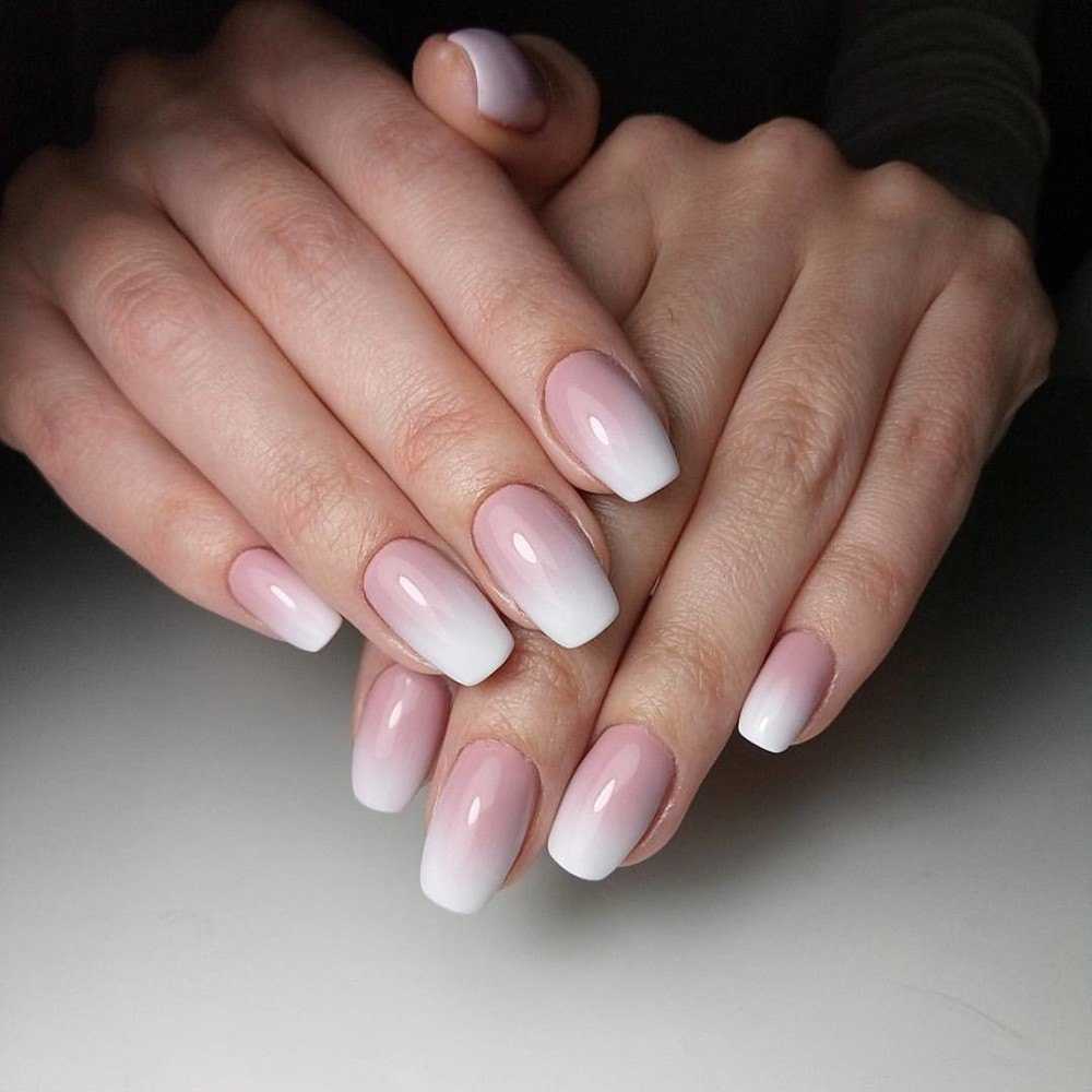Один из вариантов простой и элегантной перетяжки цветов – френч-омбре. Плавный переход розового или бежевого в белый выглядит нежно и ненавязчиво. И, кстати, именно этот маникюр омбре на короткие ногти выгодно сядет, оптически удлинив и создав недостающий объем. Поэкспериментировать можно с цветными кончиками или на тему лунного френча, нарисовав на градиентной подложке аккуратную «улыбку» у лунки.