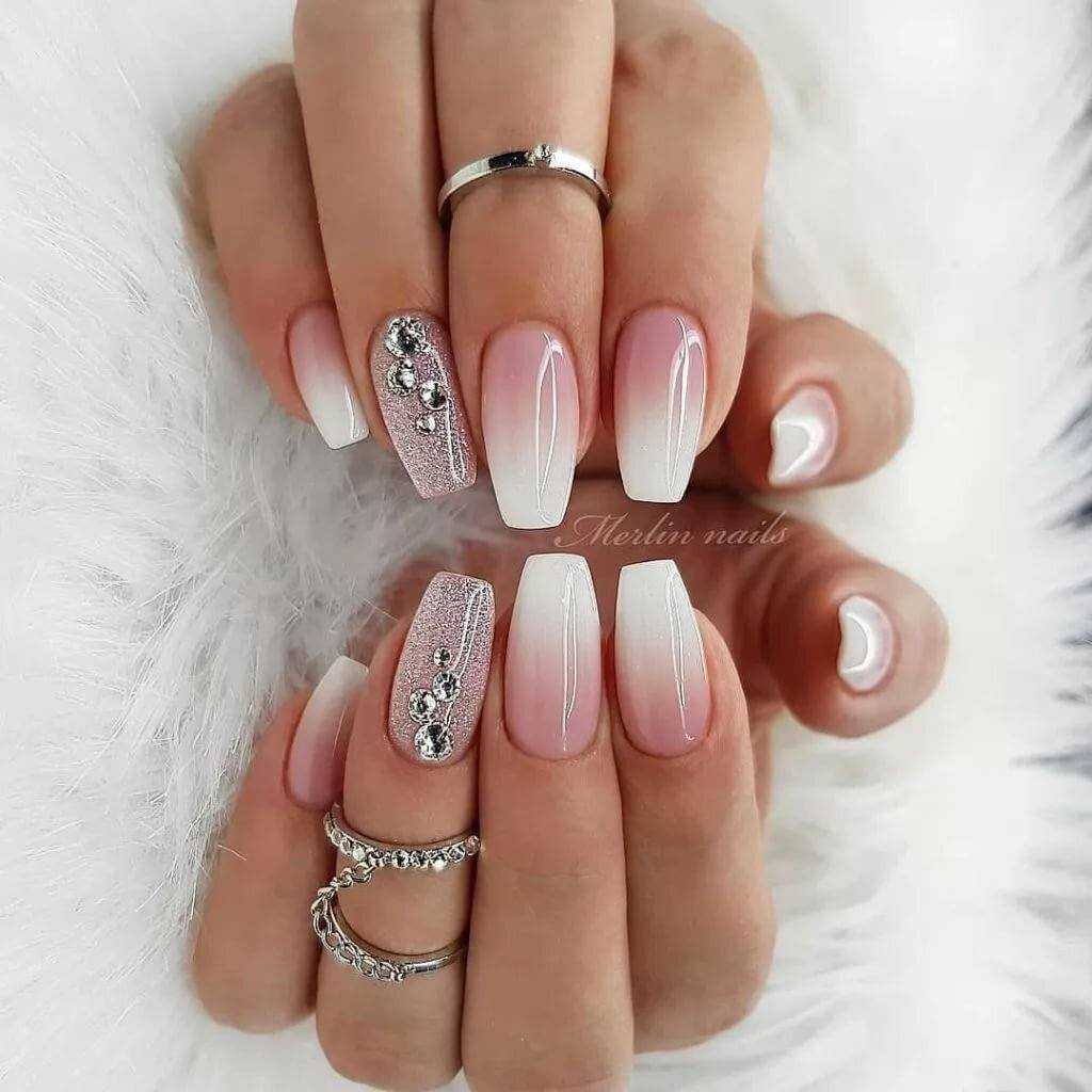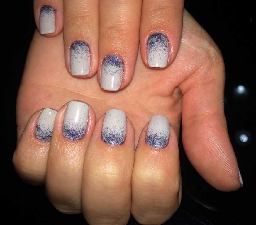 Белоснежный. В дуэте с блестящей растяжкой эффектно смотрится абсолютно любой лак, выдержанный в белоснежной гамме. Допустимы в данном случае, как полупрозрачные покрытия молочного, так и высокопигментированные белого цвета. Что до самых блесток, это могут быть варианты в виде песка или пыли, так и ажурный глиттер. Выкладывать их можно лишь на кончиках пластин, тем самым создавая нечто подобное французскому маникюру. Также блестками можно покрыть большую часть ноготка, имитируя подтеки. Ещё один вариант — это создать из шиммера разных цветов своеобразное омбре с контрастными переходами, которое должно украшать исключительно один палец.