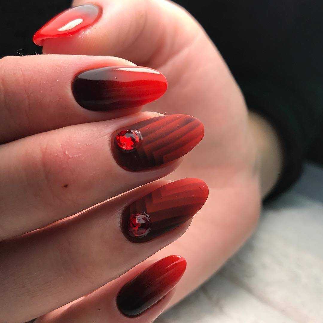Еще одна из новинок — это сочетание глянцевого топа на кончиках ноготков и матового топа на основании. Причем, это могут быть как полностью красные ноготки, так и сочетание красного основания с белой или черной линией улыбки. Посмотрите, как необычно и стильно смотрятся разные варианты таких сочетаний.