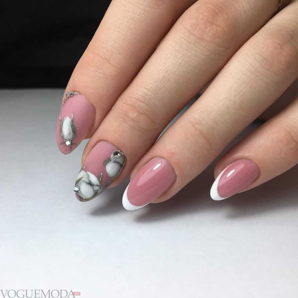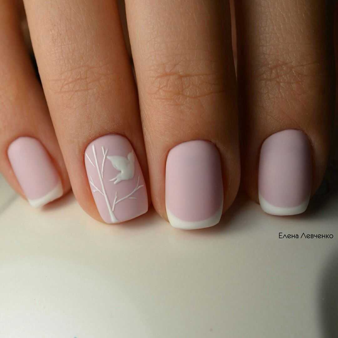 Стильно и элегантно смотрится френч в сочетании с рисунками цветов, веточек, сердечек, микки маусов или каких-нибудь надписей. Под матовым топом такой дизайн выглядит просто шикарно.